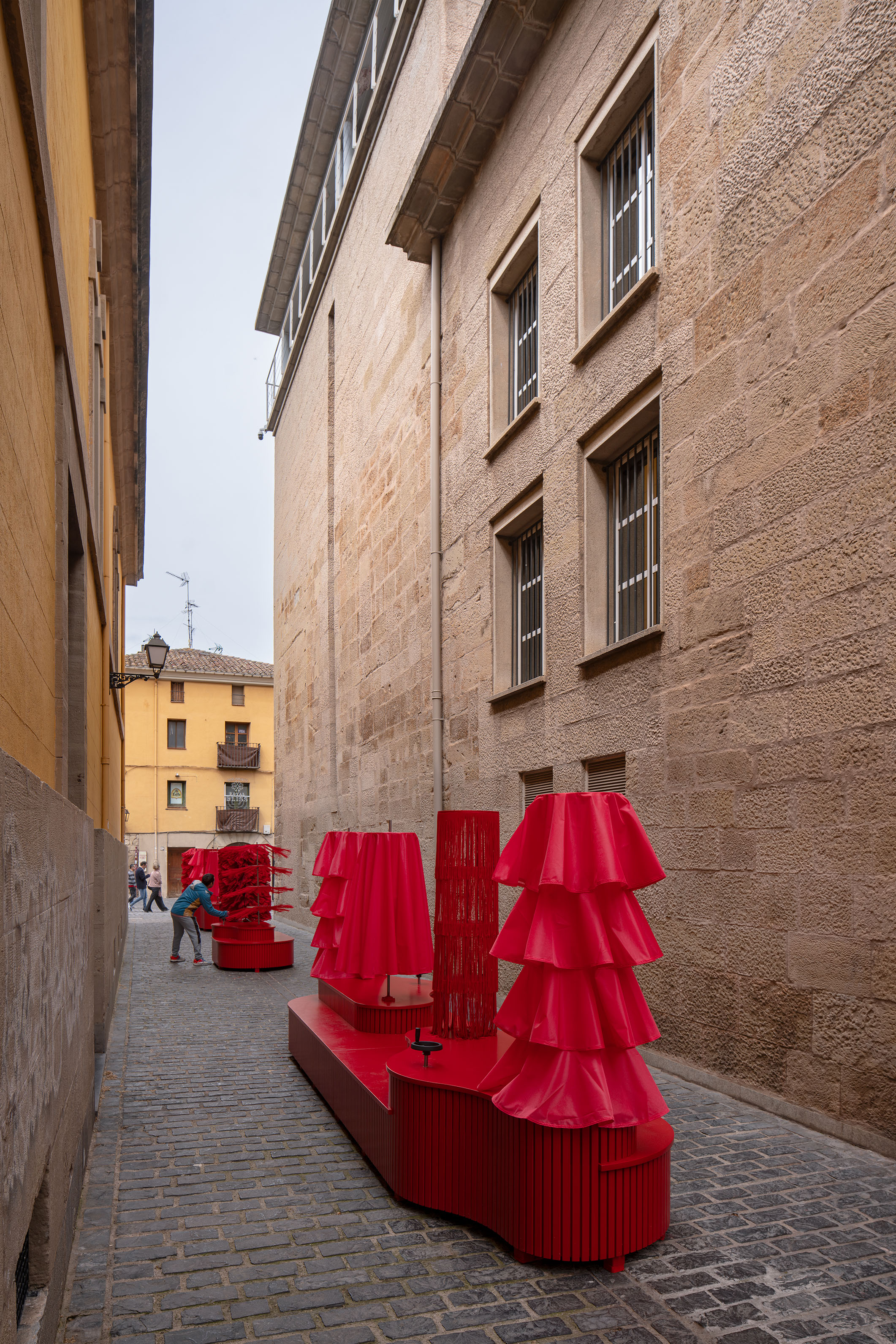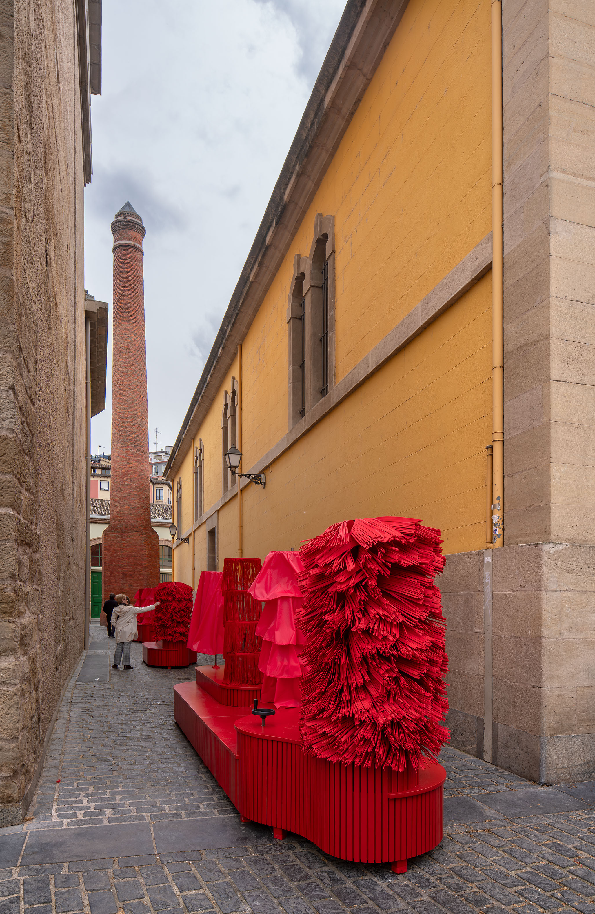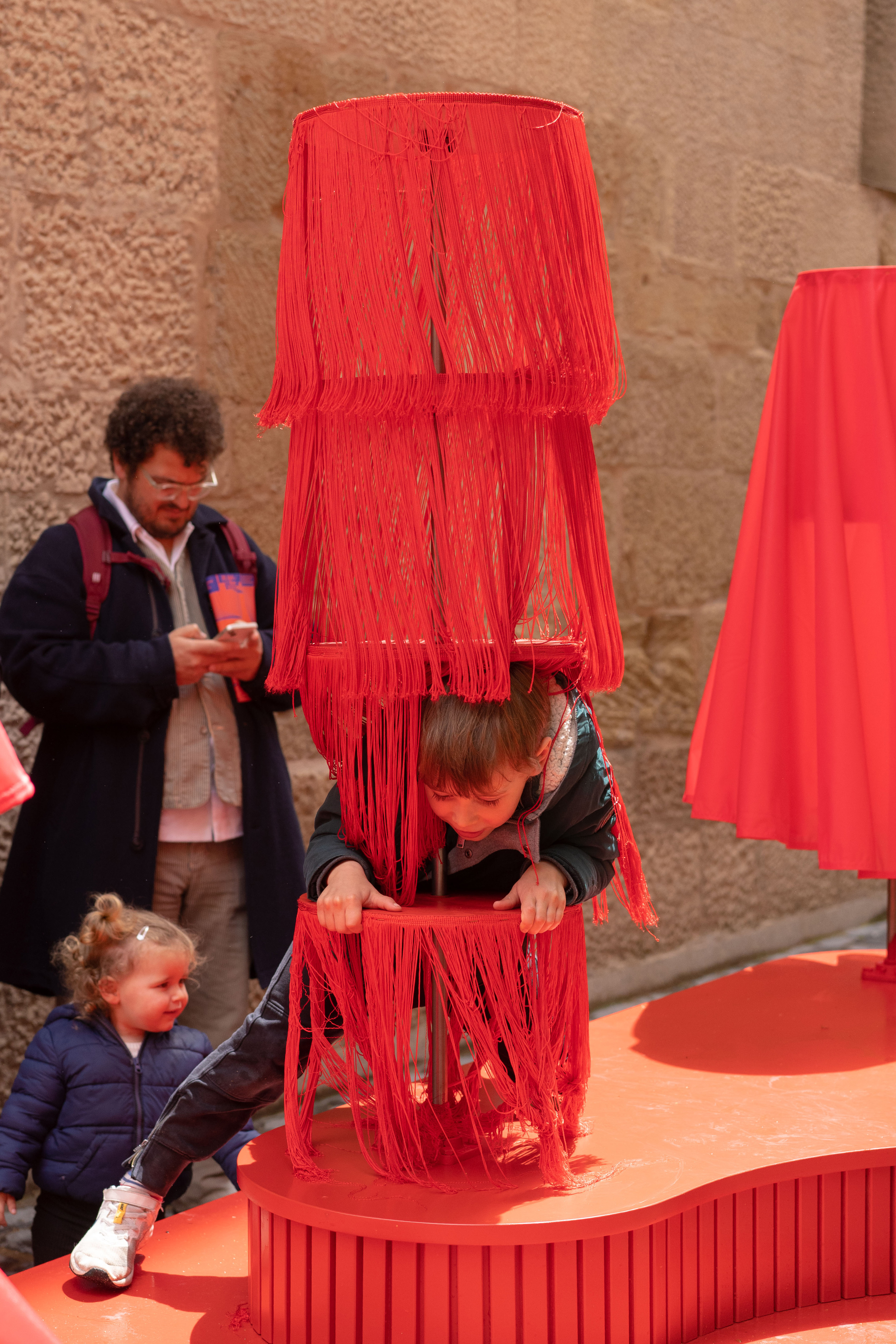 Presented as part of the 10th edition of the Concéntrico Festival in Logroño, Spain, the architectural installation "Dancing Carwash" invites you to join its mysterious choreography. Dance and movement are a symbol of joy and celebration, offering a unique experience of the space around us. Traditional Spanish and local dances, such as the stilt dances of Anguiano or flamenco, incorporate hypnotic rotations into their choreography, for both dancers and spectators alike. "Dancing Carwash" seeks to recreate the experience of these rotations for visitors, evoking the dresses and fringes of dancers' costumes as they inflate and unfold during traditional dances. To question this evolving relationship between the volume of objects, the installation draws inspiration from a daily artifact rooted in childhood memories: the automatic car wash. At rest, the car wash’s columns play with the classical composition of an urban passage. The columns are arranged on a base that functions as a turntable, with integrated wooden gears. The columns are set in motion by the rotation of the base via a crank. As they move, the colorful filaments and fabrics unfurl, expanding the column’s volume. The different sizes of filaments and "skirts" create a festive atmosphere, inviting visitors to touch, dance, feel, and play. "Dancing Carwash" invites you to partake in its vibrant celebration and hypnotic movements!