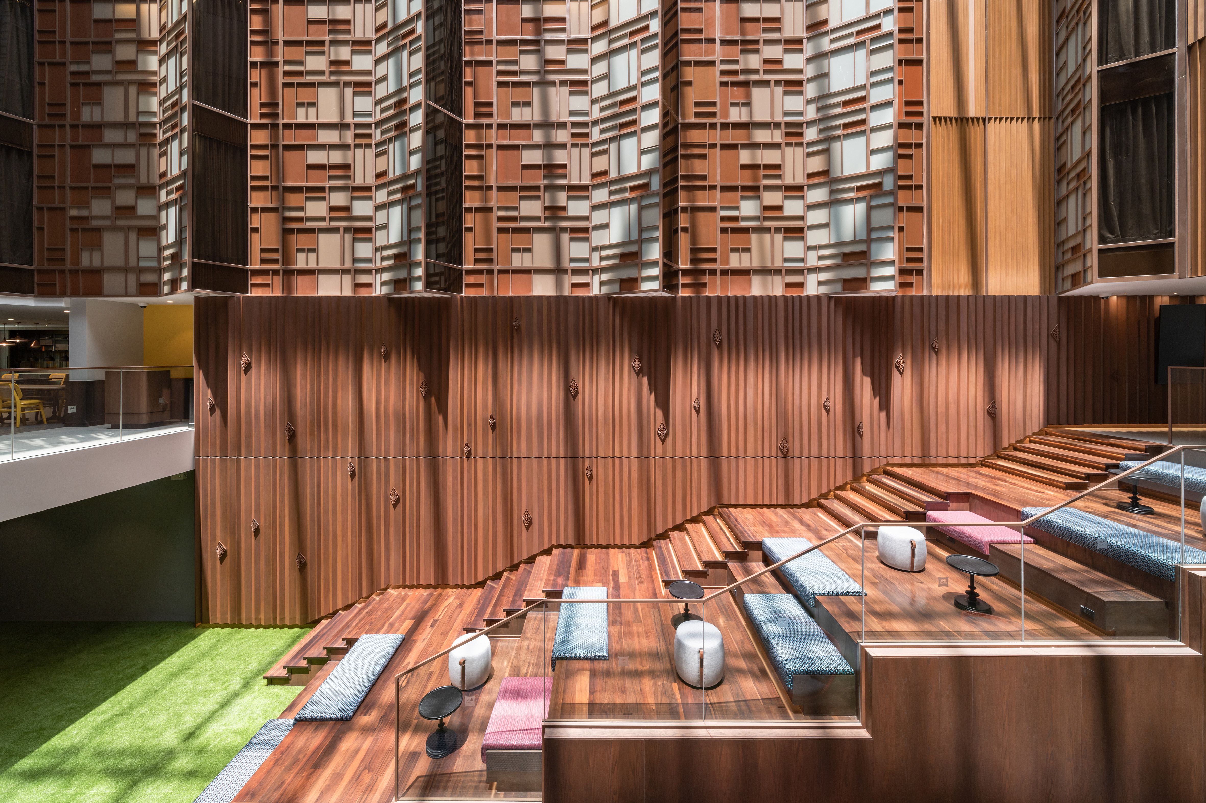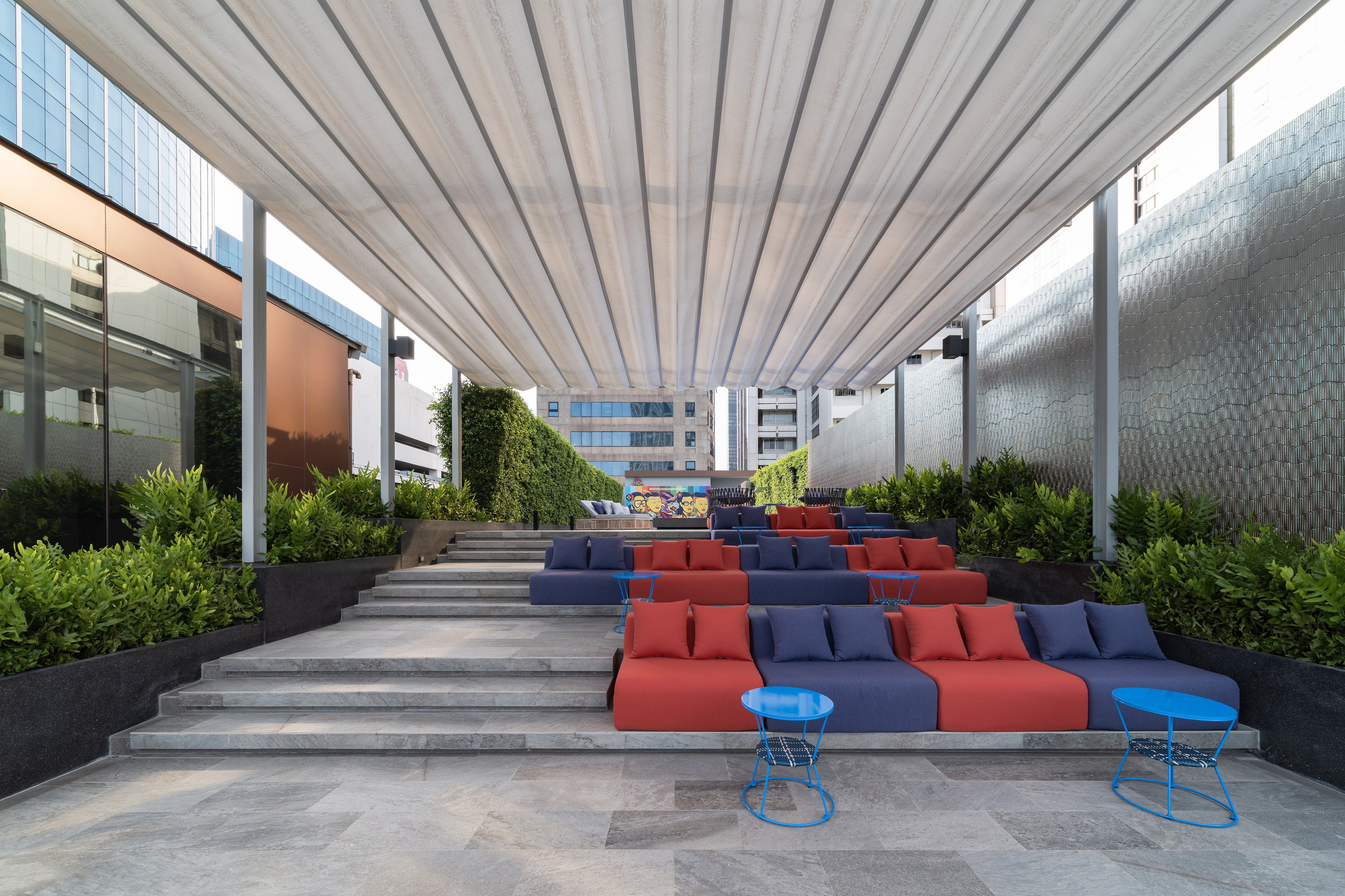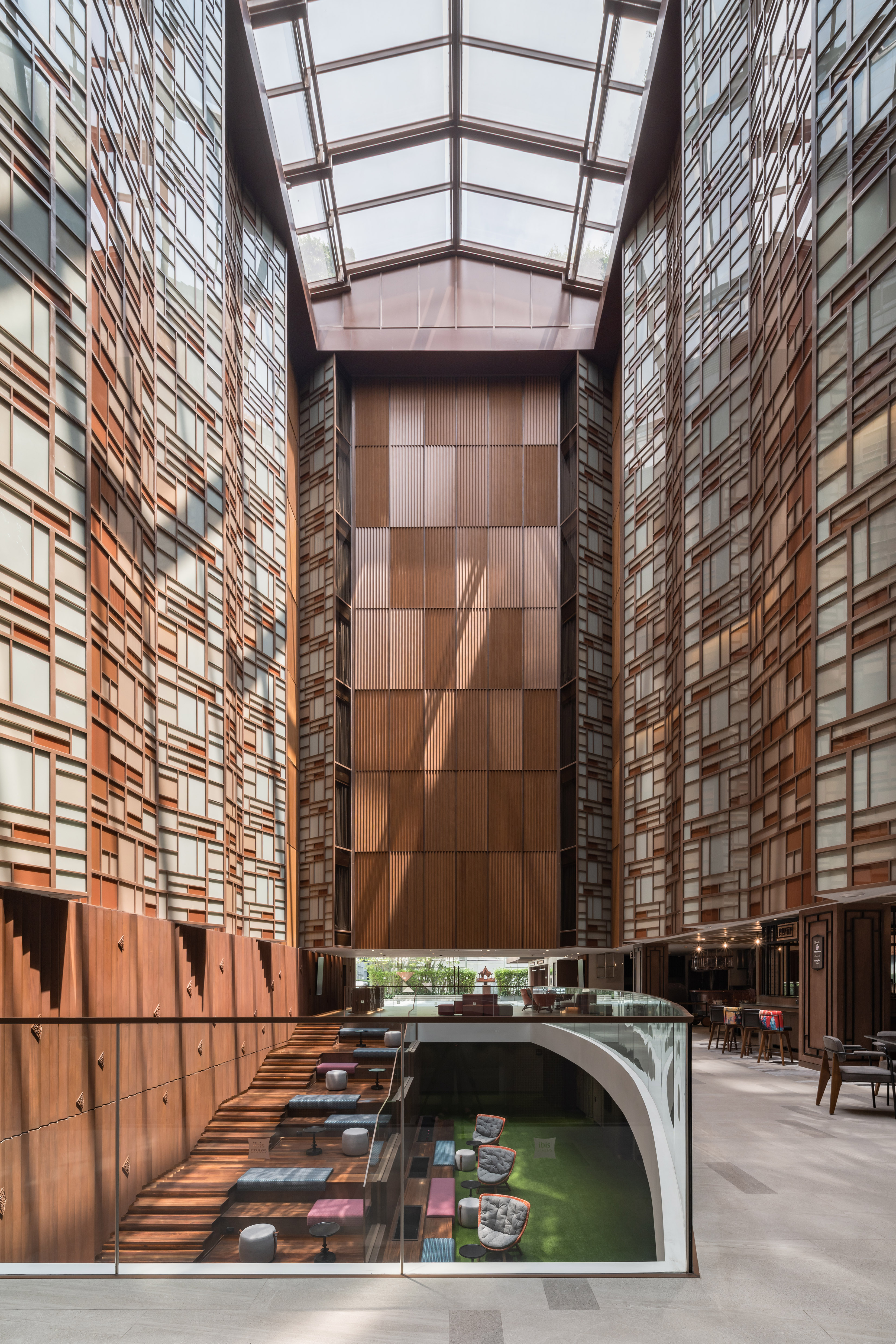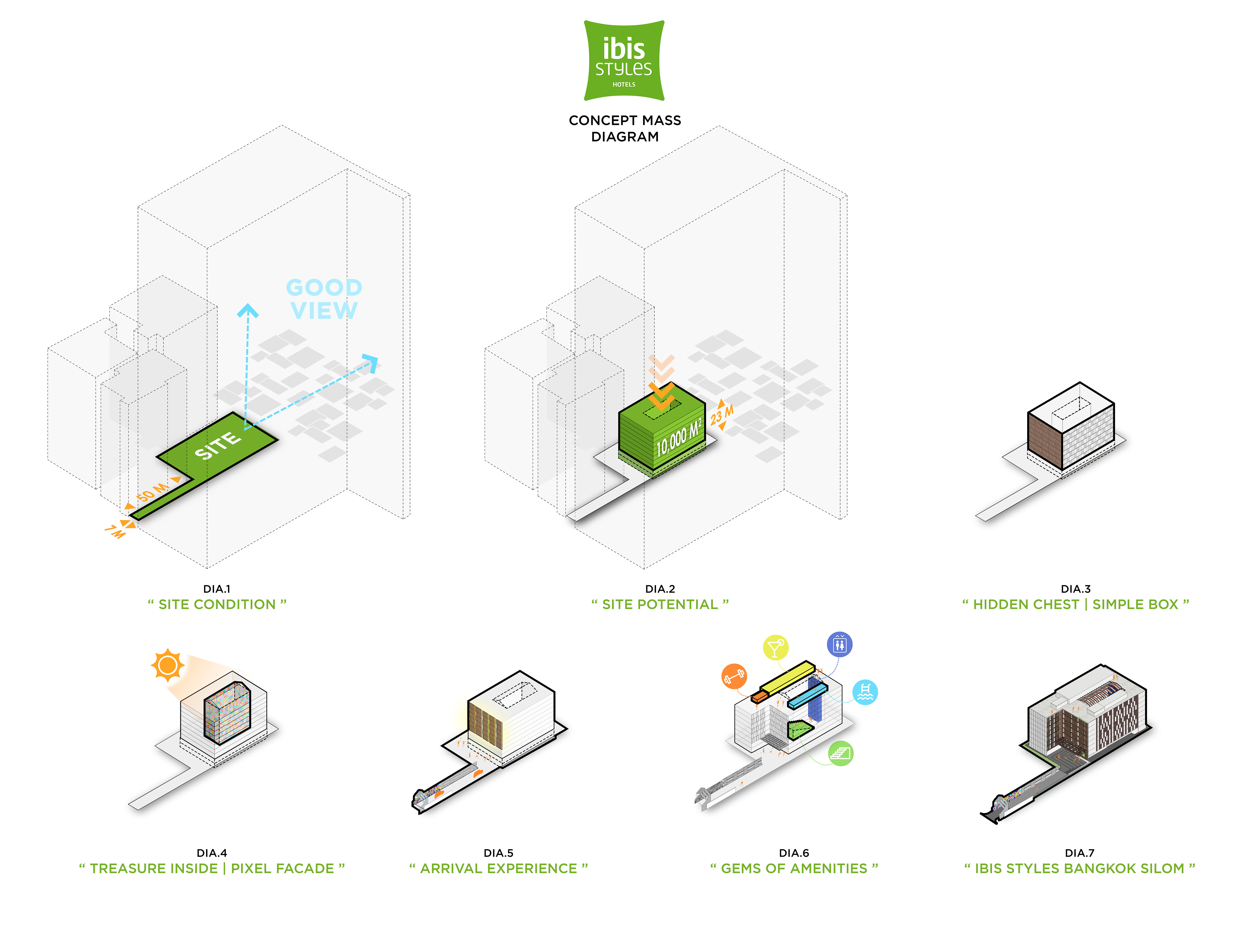 Ibis Styles Bangkok Silom – A Hidden Treasure in the Urban Core Located deep within a narrow alley off Silom Road—Bangkok’s prime business and tourism corridor—the Ibis Styles Bangkok Silom is a 9,999 sq.m. hospitality project developed on a constrained 2,272 sq.m. site. Hemmed in by high-rise towers and set back from major visibility, the site posed a unique architectural challenge: turning invisibility into identity. Rather than treat this condition as a limitation, we embraced it as the project’s conceptual driver. The hotel is envisioned as a Hidden Treasure Chest—a vibrant, unexpected destination waiting to be discovered within the city’s dense fabric. A minimalist massing strategy was adopted to optimize functional efficiency, wrapped in expressive yet restrained materials. The box-like form is articulated with pixelated glass walls and patterned color treatments, referencing the eclectic nature of the Ibis Styles brand while maintaining architectural clarity. The guest journey begins at a twisted entrance arch, carefully angled to draw the eye from nearby BTS and MRT access points. This dynamic gesture, complemented by a graffiti wall by Thai street artist Tikky Wow, sets the tone for the immersive experience inside. The central atrium—with its floating staircase, glass elevator, and skylight—acts as both a spatial anchor and a social heart, drawing daylight deep into the building and inviting guests to linger and connect. Interior and landscape elements were conceived as extensions of the architectural narrative, blurring thresholds between outside and in, public and private, functional and expressive. Every design decision—from circulation to finishes—was guided by the goal of transforming site limitations into a cohesive identity. In doing so, ibis Styles Bangkok Silom becomes not just a place to stay, but a story to uncover.