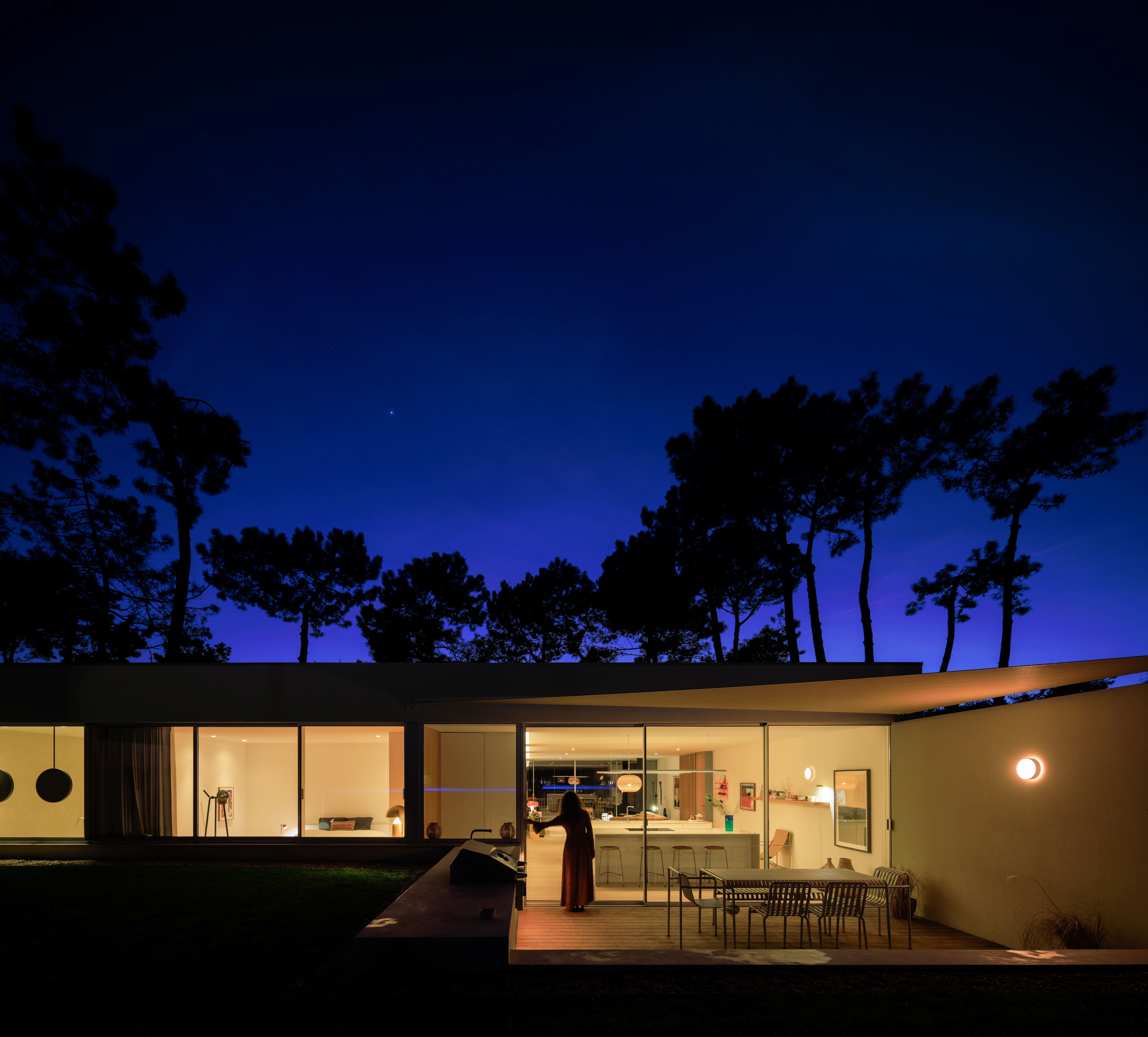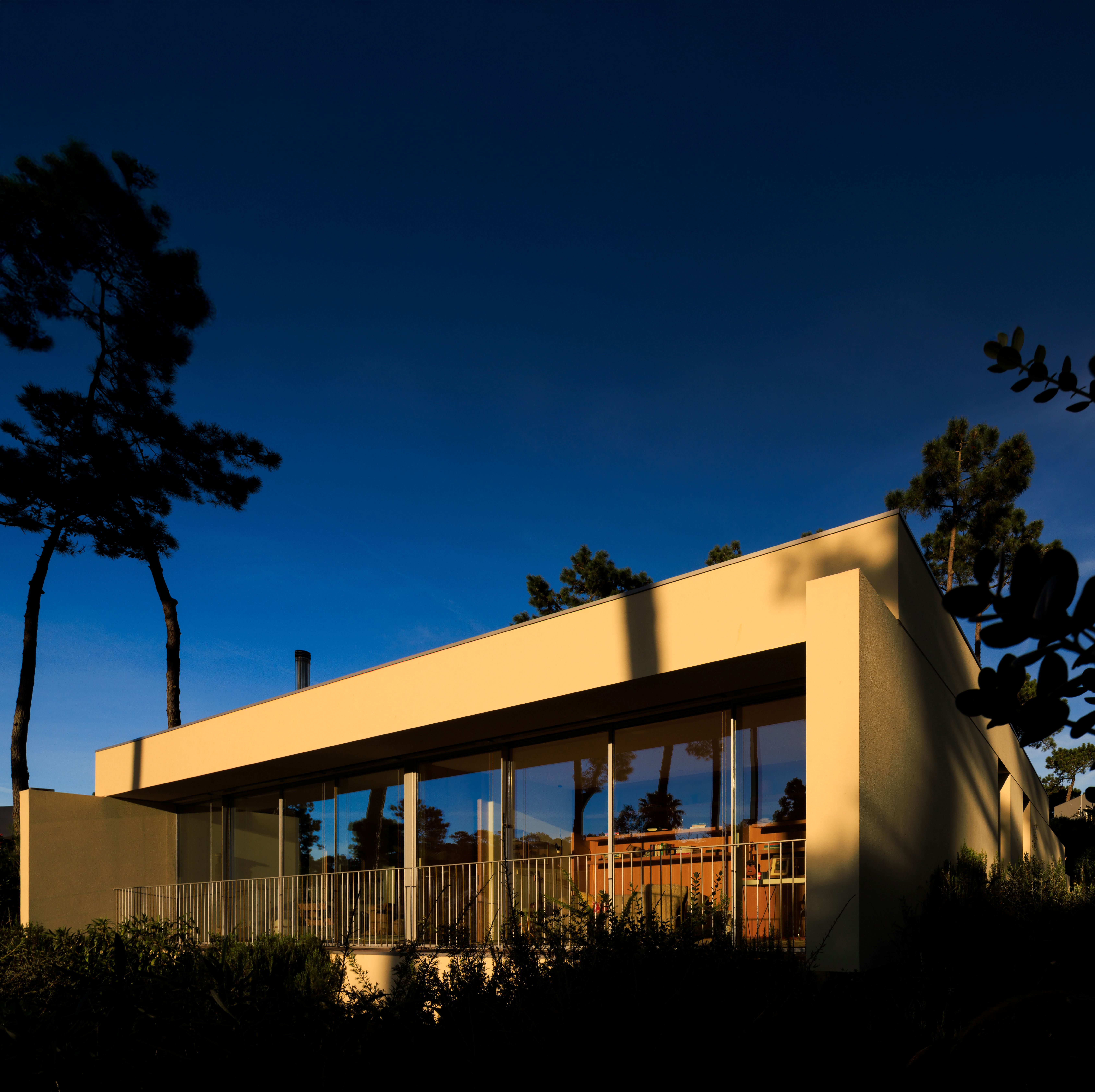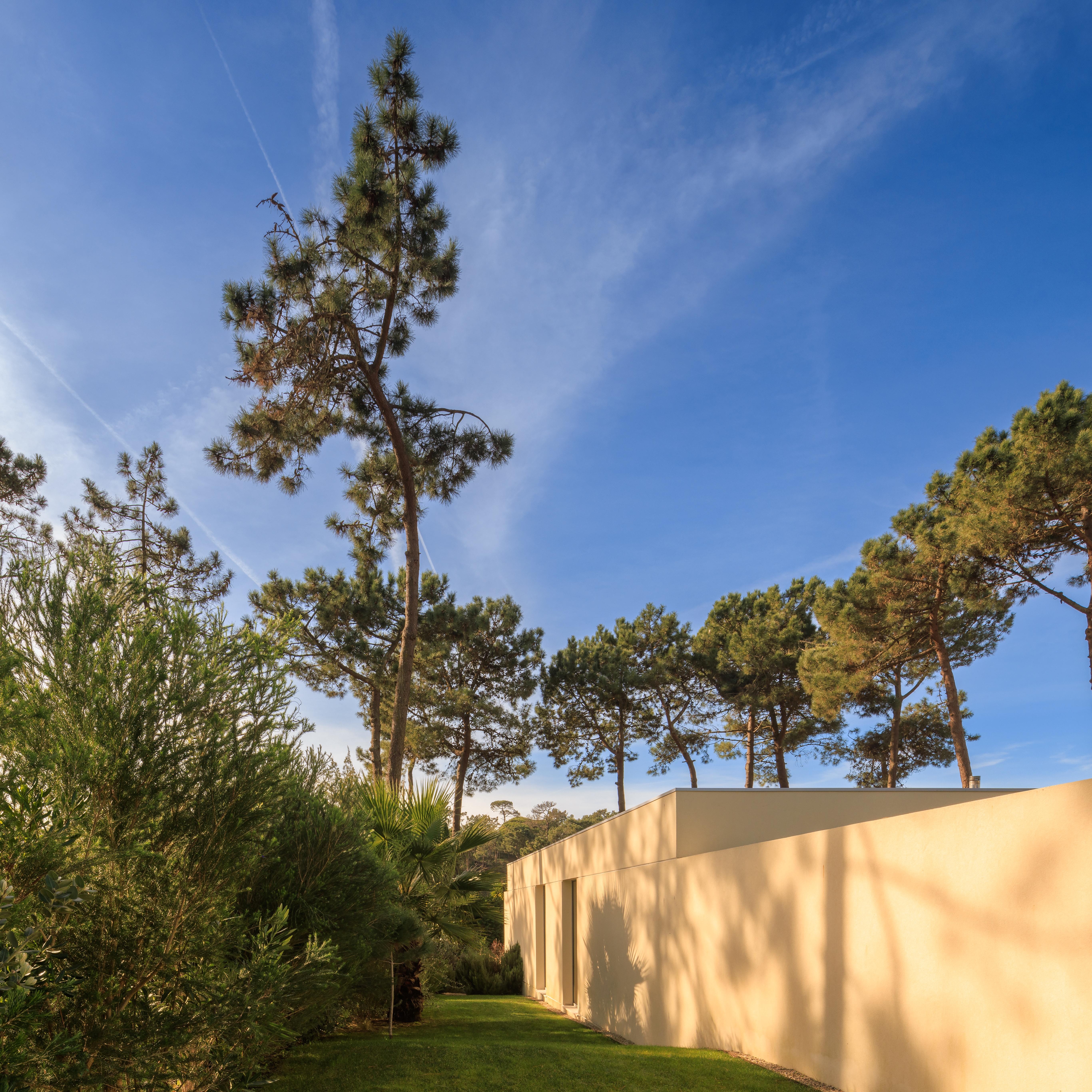 Casa Calma is located in a pine forest near the beach, and its main purpose was to serve as a refuge from the more chaotic life of the city centre. Conceptually, to achieve this goal, four “blades” were used: two horizontal ones that make up the floor and roof and two vertical ones that make up the walls. These four elements share the same materiality, but recessed profiles are used between them to accentuate their individuality and at the same time mark the structural dependence between them. In addition to the sand tone that covers the house, white stucco, glass, aluminium and wood predominate. The house programme, adaptation to the slight slope of the plot, opening up of windows and exposure to the weather, was developed always prioritising the integrity of the initial concept, which despite being somewhat rigid, constitutes a blank canvas for the display of personal items and objects on the inside, while on the outside is in progress an appropriation of the construction by the garden, softening the inflexibility of the design.