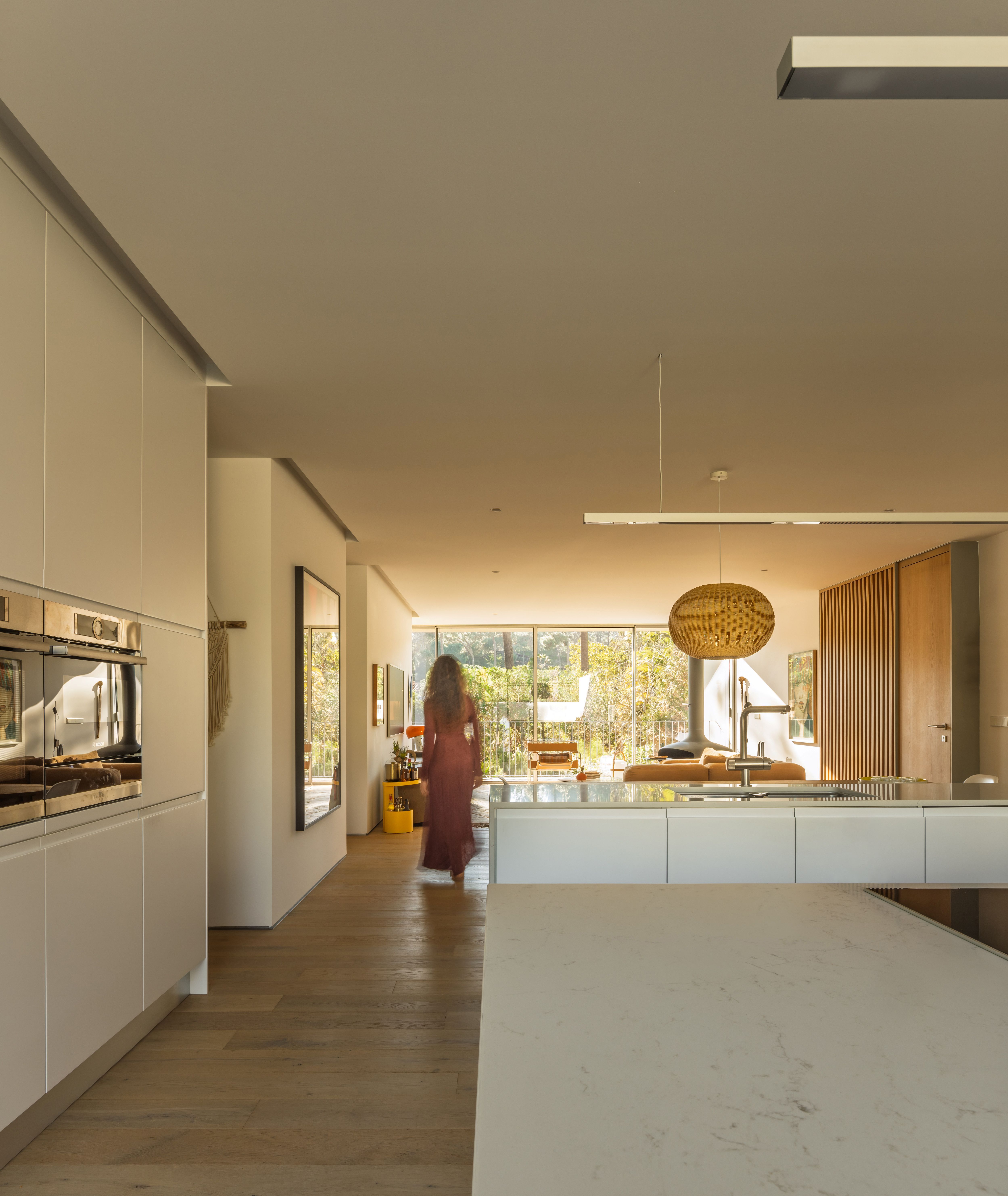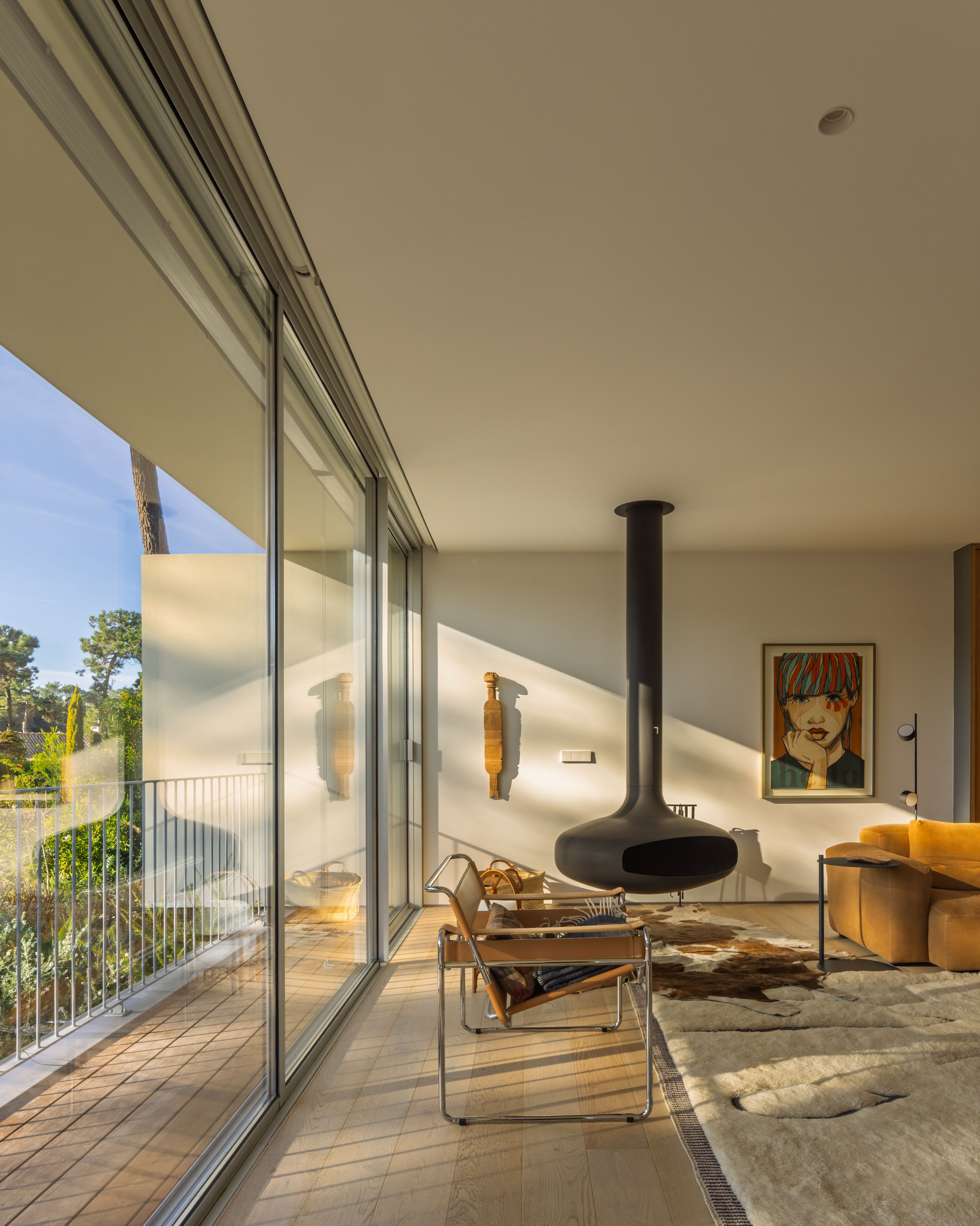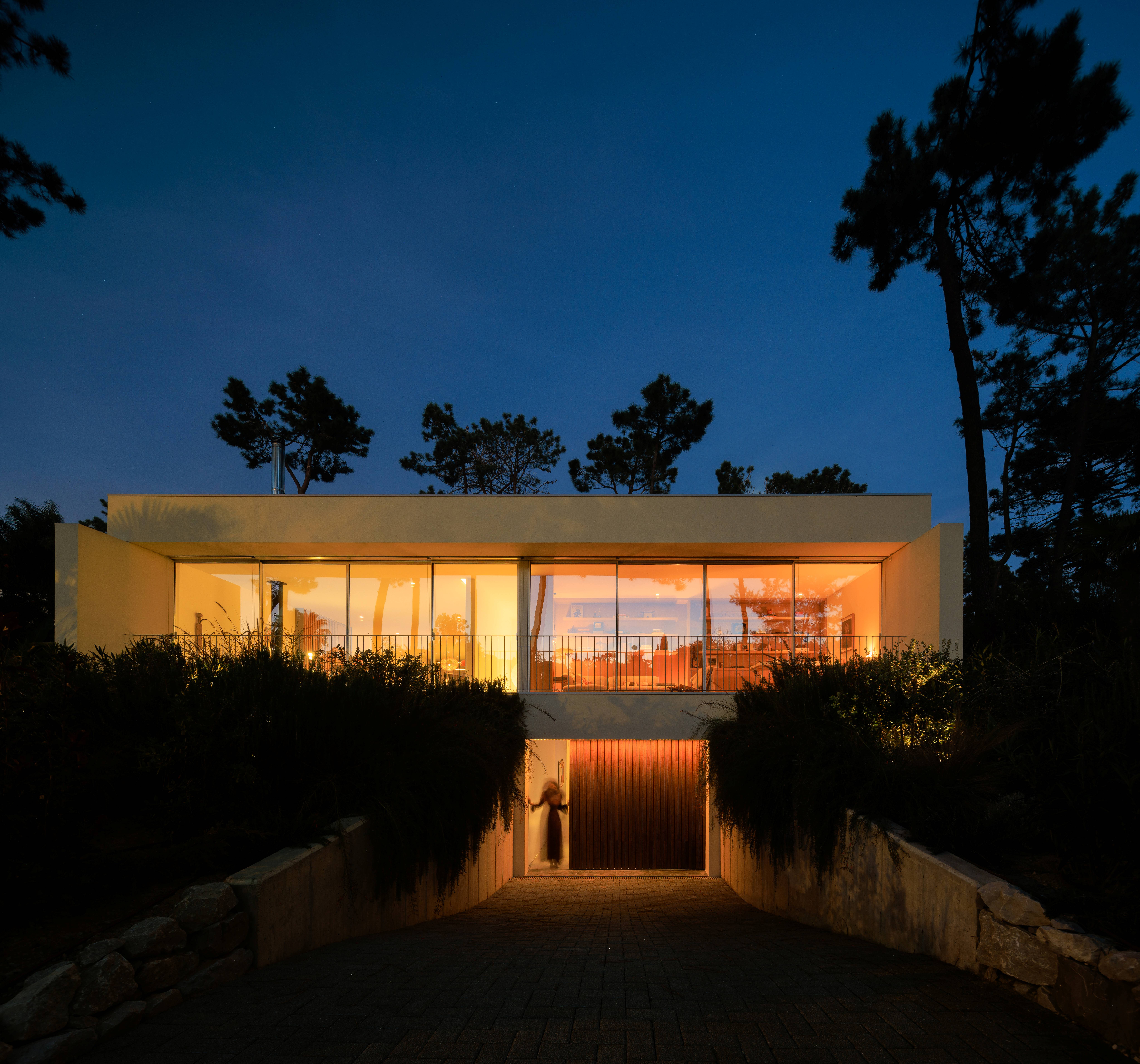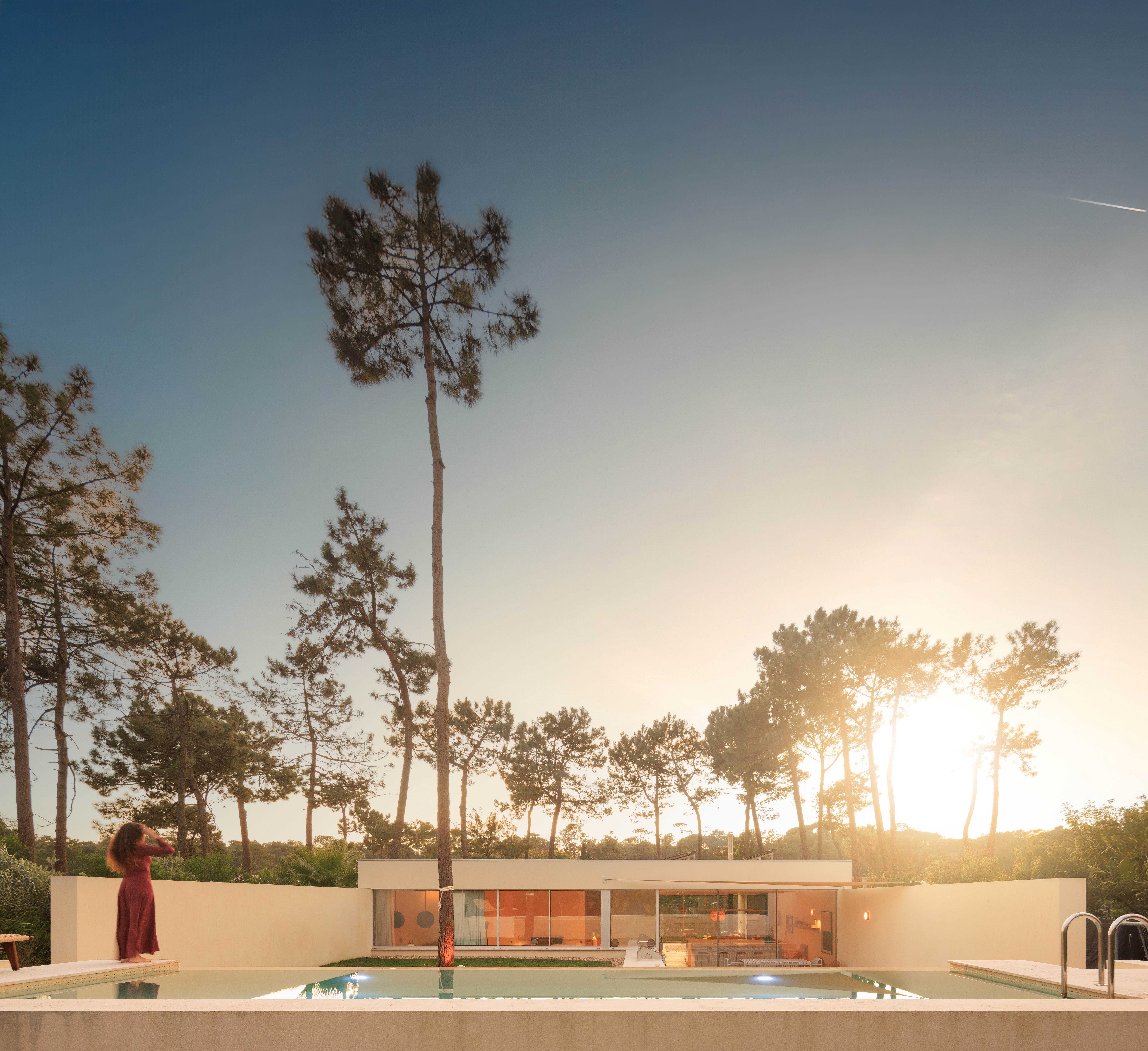 Casa Calma is located in a pine forest near the beach, and its main purpose was to serve as a refuge from the more chaotic life of the city centre. Conceptually, to achieve this goal, four “blades” were used: two horizontal ones that make up the floor and roof and two vertical ones that make up the walls. These four elements share the same materiality, but recessed profiles are used between them to accentuate their individuality and at the same time mark the structural dependence between them. In addition to the sand tone that covers the house, white stucco, glass, aluminium and wood predominate. The house programme, adaptation to the slight slope of the plot, opening up of windows and exposure to the weather, was developed always prioritising the integrity of the initial concept, which despite being somewhat rigid, constitutes a blank canvas for the display of personal items and objects on the inside, while on the outside is in progress an appropriation of the construction by the garden, softening the inflexibility of the design.