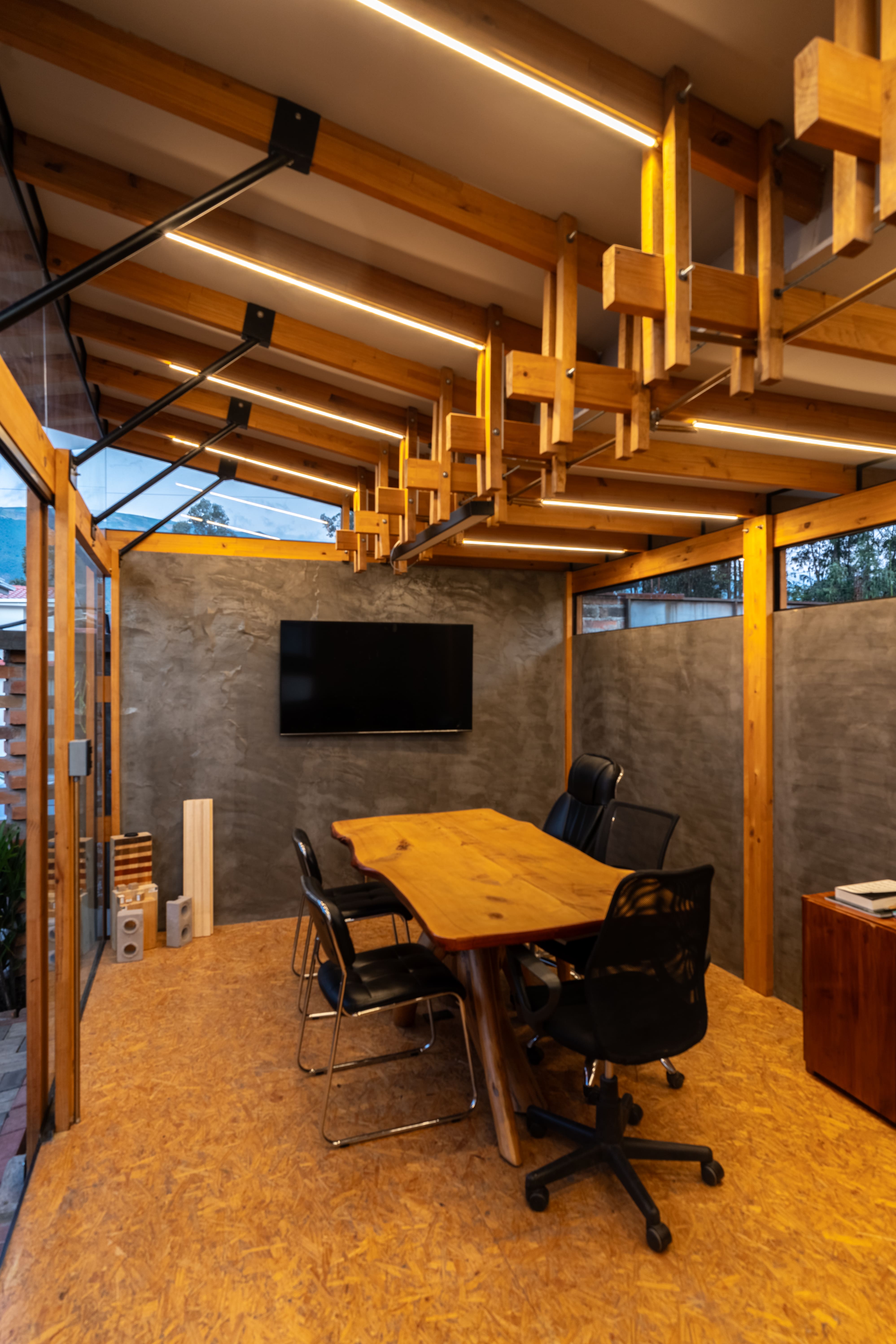 Taller Atemporal emerges as a conscious and flexible architectural response to the complexities of today's urban landscape. Set in a residential context, the project aims to establish a harmonious dialogue between the building and its surroundings, adopting sustainable strategies and innovative practices that minimize its environmental impact. Its conception integrates principles of convergence between architecture and landscape, where the built space is not seen as an isolated object but as an extension of the environment, enriching and respecting the local identity. This 18 m² space is designed to serve multiple functions: coworking, showroom, project workshop, and primarily our architecture office. The versatility of its spatial configuration allows these activities to coexist without formal alterations, reflecting a design approach that prioritizes adaptability. Through minimalist architecture, Taller Atemporal fosters a more human interaction with the surrounding natural environment, reducing its ecological footprint during construction and in its later use. The project's structure is a single open space where the roof plays a key role, functioning not only as a structural element but also as a visual and symbolic resource that unifies the space. By elevating the roof to a hierarchical plane within the design, the floor plan is freed, allowing natural light to flood the interior and act as the primary element defining the spatial experience. This treatment of light reinforces the relationship between the living space and the exterior landscape. In terms of construction, the project combines materials that promote a balance between functionality, aesthetics, and sustainability. Laminated wood, the central material of the structure, stands out not only for its low environmental impact but also for its ability to create a warm, natural atmosphere. This material, sourced from certified responsibly managed forests, offers durability and energy efficiency, and its prefabrication speeds up construction time and reduces costs, in line with