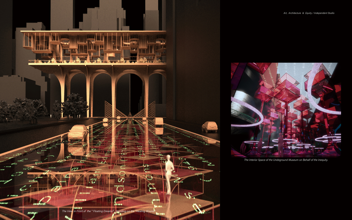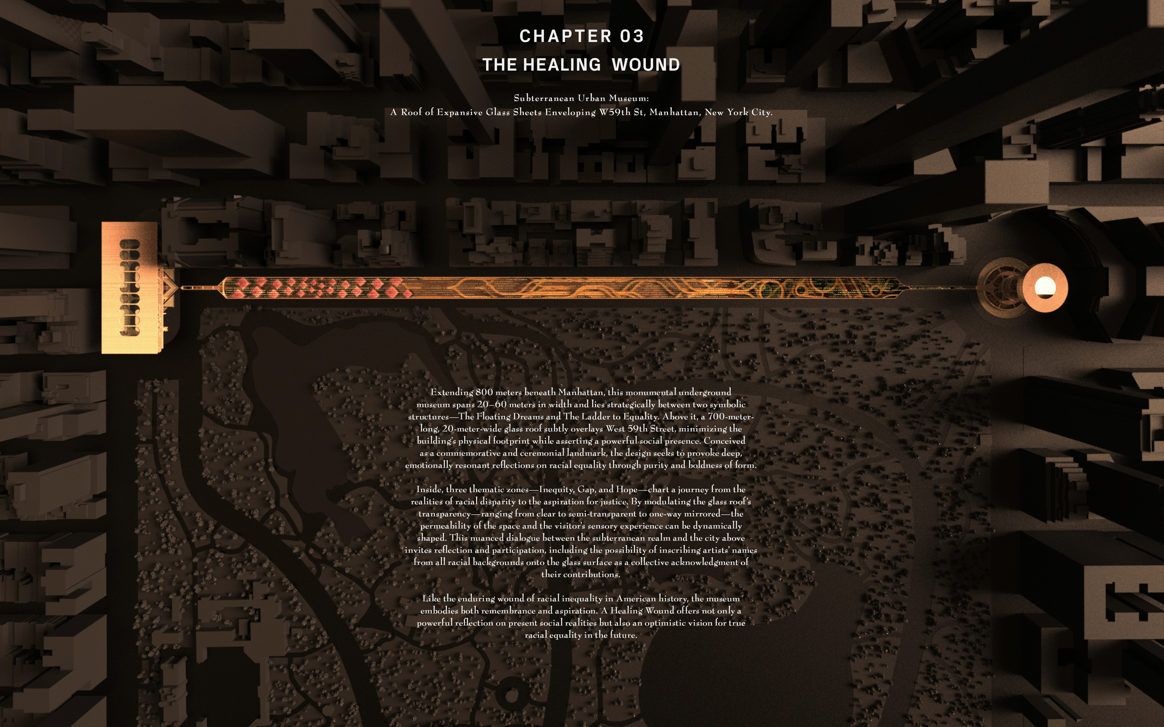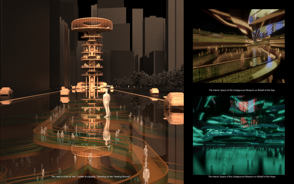 The 21st Century Arts Center for Equality The 21st Century Arts Center for Equality is an architectural response to the racial reckoning. Conceived as a critique and blueprint, it embeds inclusivity, equity, and representation into design practice. Three interlinked chapters shape the project: The Floating Dreams, a collaborative creation centre for artists of all backgrounds; The Ladder to Equality, a public gallery fostering cross-cultural dialogue; and The Healing Wound: 01. The Floating Dreams – Creation Centre A collaborative and private space for artists and designers of all racial backgrounds to create, experiment, and exchange ideas. 02. The Ladder to Equality – Communication Gallery An inclusive public arena for art appreciation and cross-cultural dialogue, dismantling barriers between creators and audiences. 03. The Healing Wound – Subterranean Urban Museum A monumental underground museum extending 800 meters beneath Manhattan and spanning 20-60 meters in width. Positioned between the two symbolic structures, it is crowned by a 700-meter-long glass roof subtly overlaying West 59th Street. This minimal footprint above ground asserts a bold social presence below, offering a commemorative and ceremonial space for reflection on racial equality. Like the enduring wound of inequality in American history, The Healing Wound embodies both remembrance and hope - transforming a collective scar into an optimistic vision of a more just cultural future. More than a building, this landmark transforms a collective scar into a shared hope, offering an immersive, commemorative journey toward a more just cultural future.