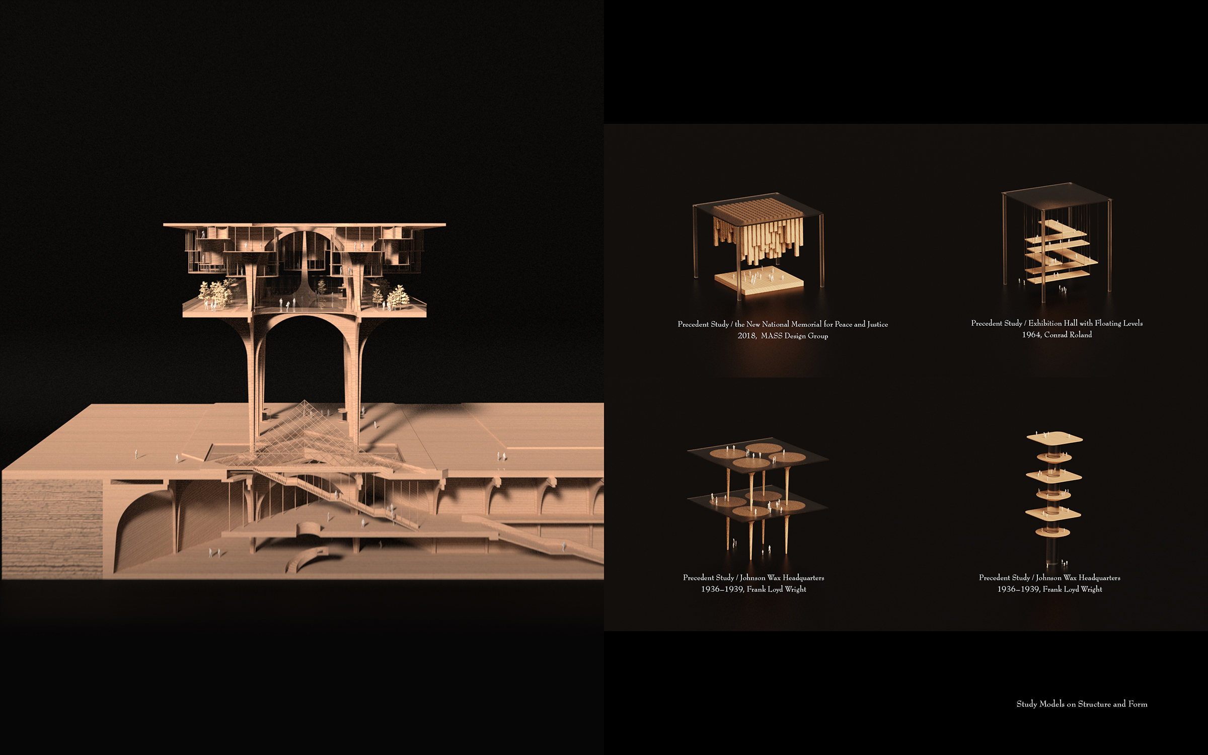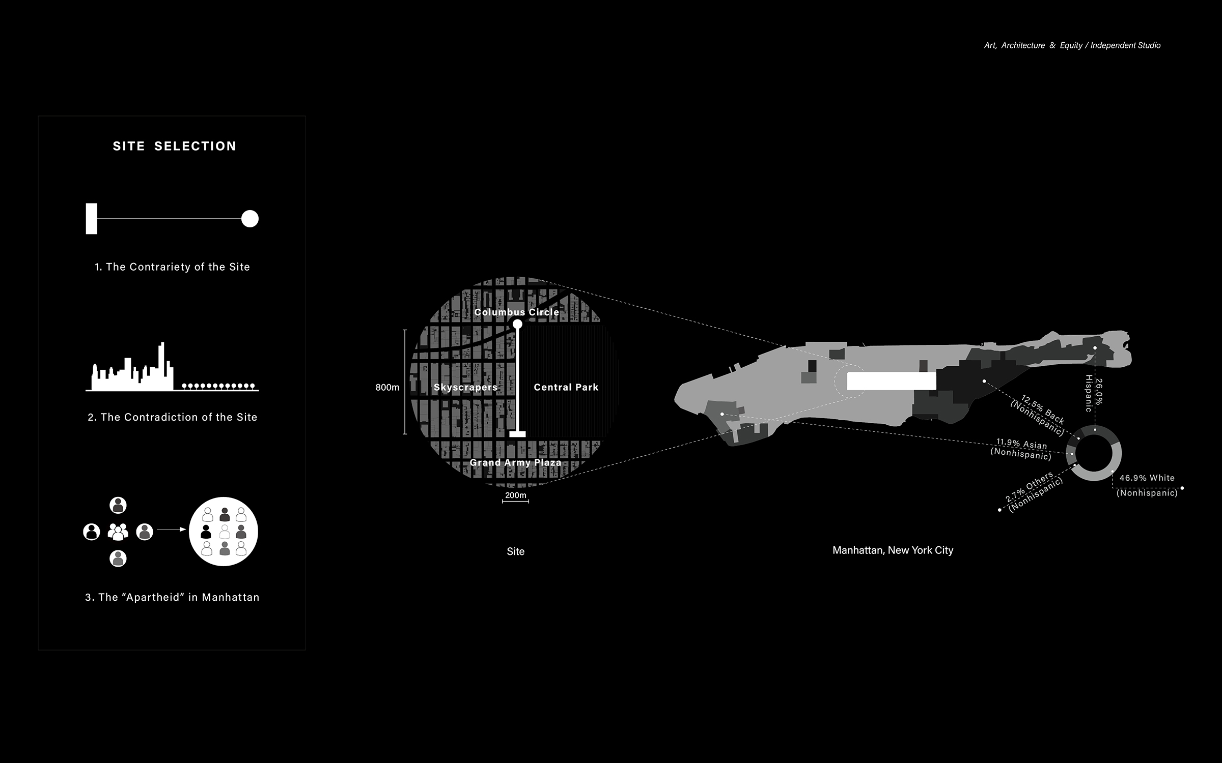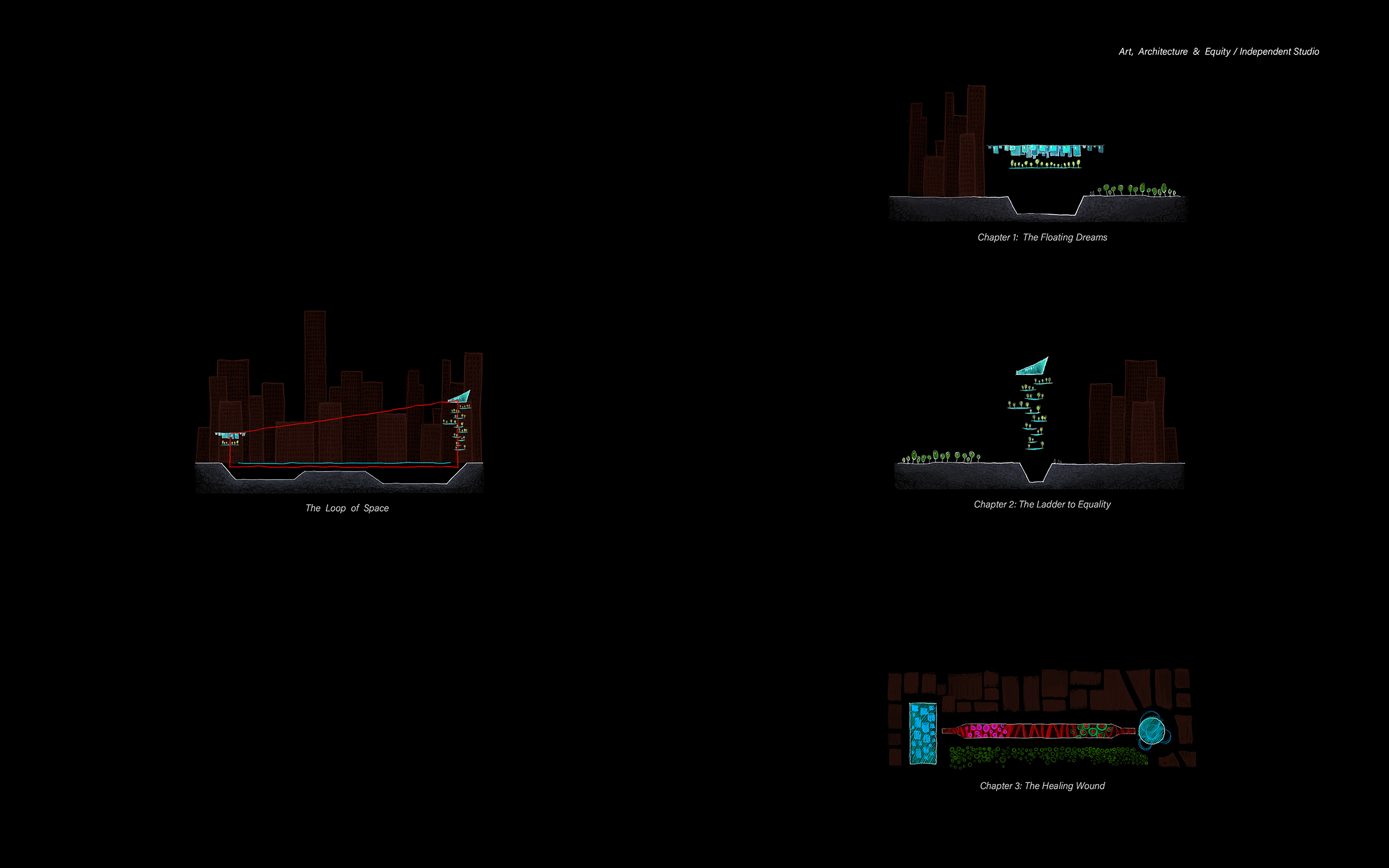 The 21st Century Arts Center for Equality The 21st Century Arts Center for Equality is an architectural response to the racial reckoning. Conceived as a critique and blueprint, it embeds inclusivity, equity, and representation into design practice. Three interlinked chapters shape the project: The Floating Dreams, a collaborative creation centre for artists of all backgrounds; The Ladder to Equality, a public gallery fostering cross-cultural dialogue; and The Healing Wound: 01. The Floating Dreams – Creation Centre A collaborative and private space for artists and designers of all racial backgrounds to create, experiment, and exchange ideas. 02. The Ladder to Equality – Communication Gallery An inclusive public arena for art appreciation and cross-cultural dialogue, dismantling barriers between creators and audiences. 03. The Healing Wound – Subterranean Urban Museum A monumental underground museum extending 800 meters beneath Manhattan and spanning 20-60 meters in width. Positioned between the two symbolic structures, it is crowned by a 700-meter-long glass roof subtly overlaying West 59th Street. This minimal footprint above ground asserts a bold social presence below, offering a commemorative and ceremonial space for reflection on racial equality. Like the enduring wound of inequality in American history, The Healing Wound embodies both remembrance and hope - transforming a collective scar into an optimistic vision of a more just cultural future. More than a building, this landmark transforms a collective scar into a shared hope, offering an immersive, commemorative journey toward a more just cultural future.