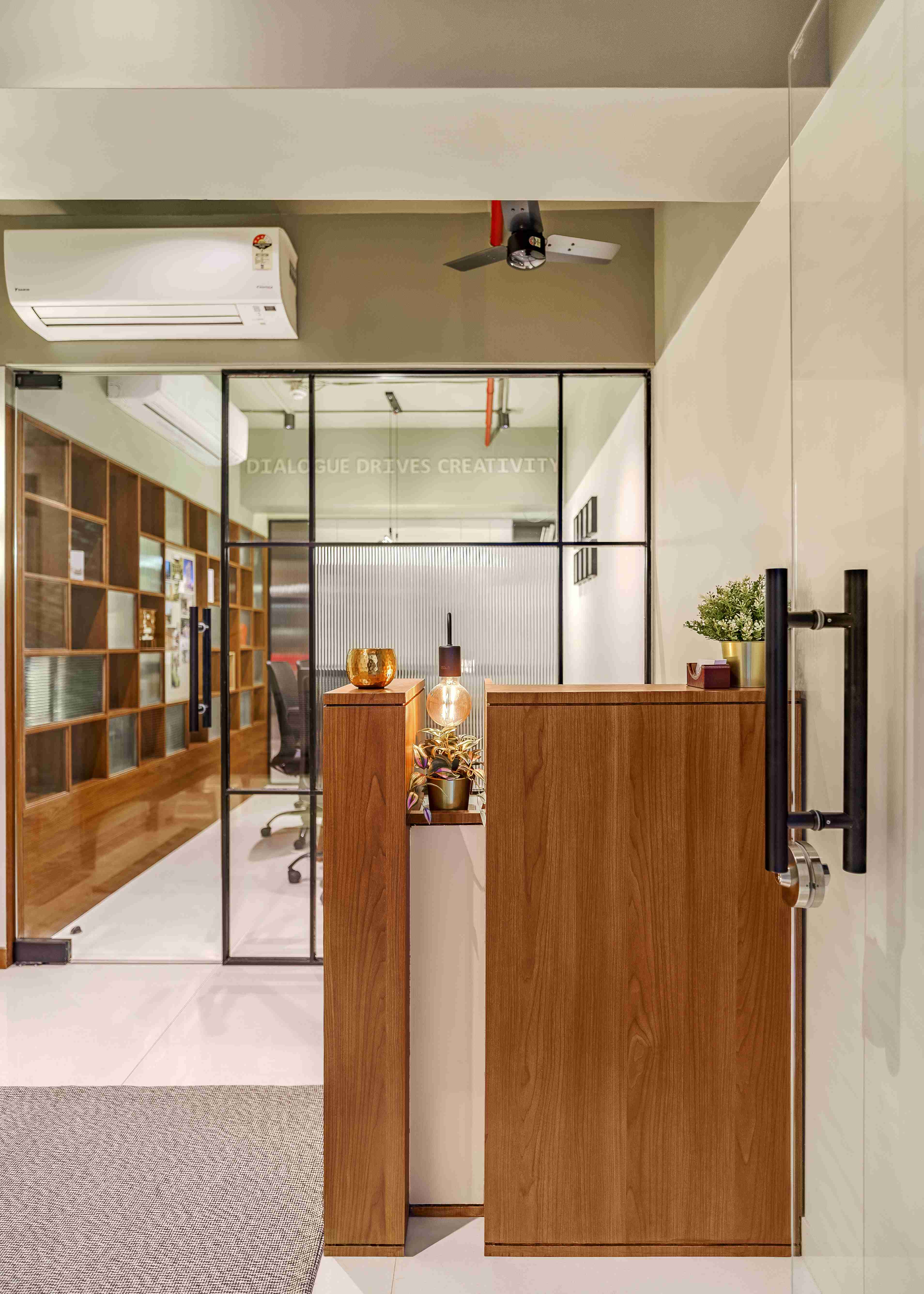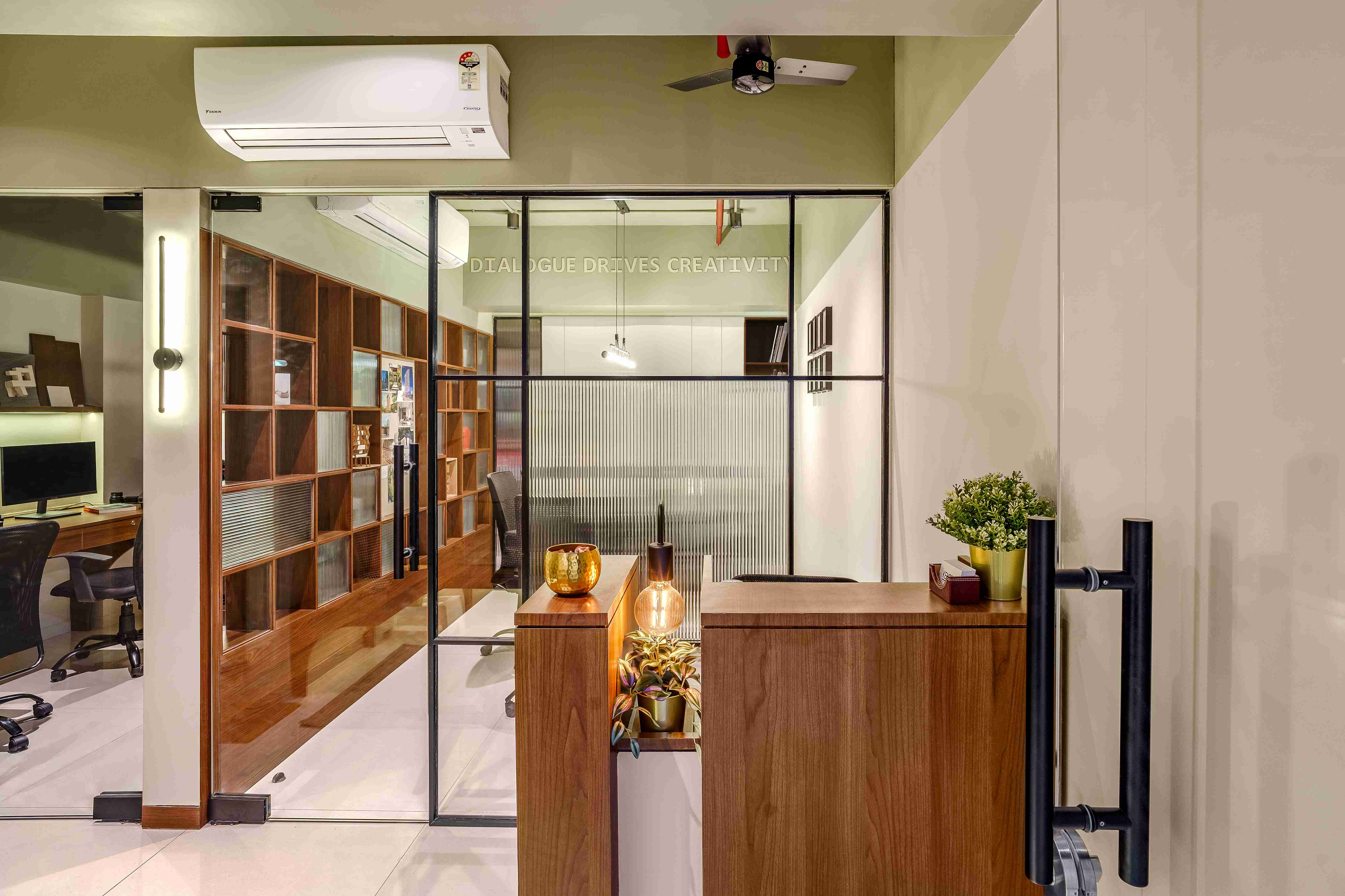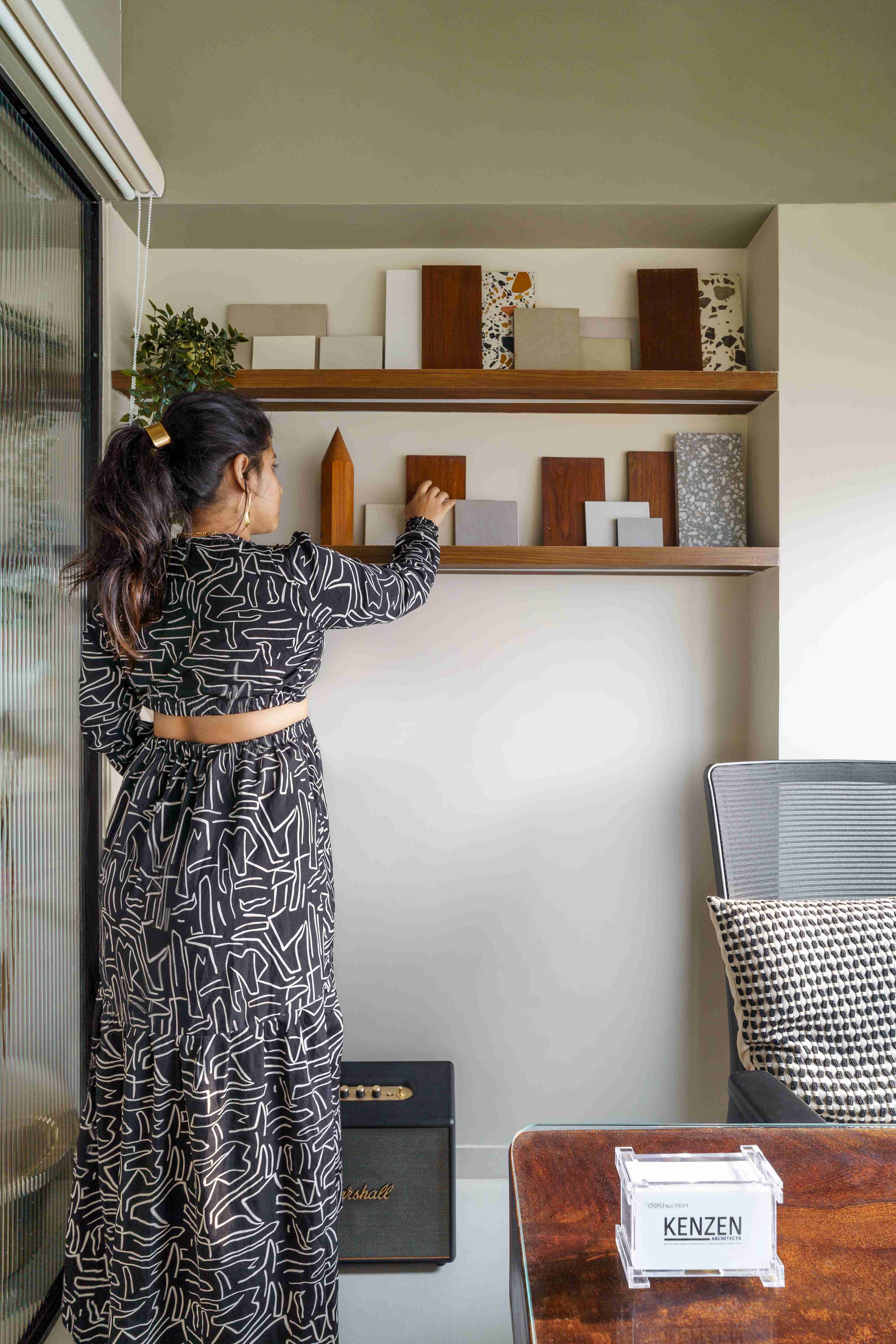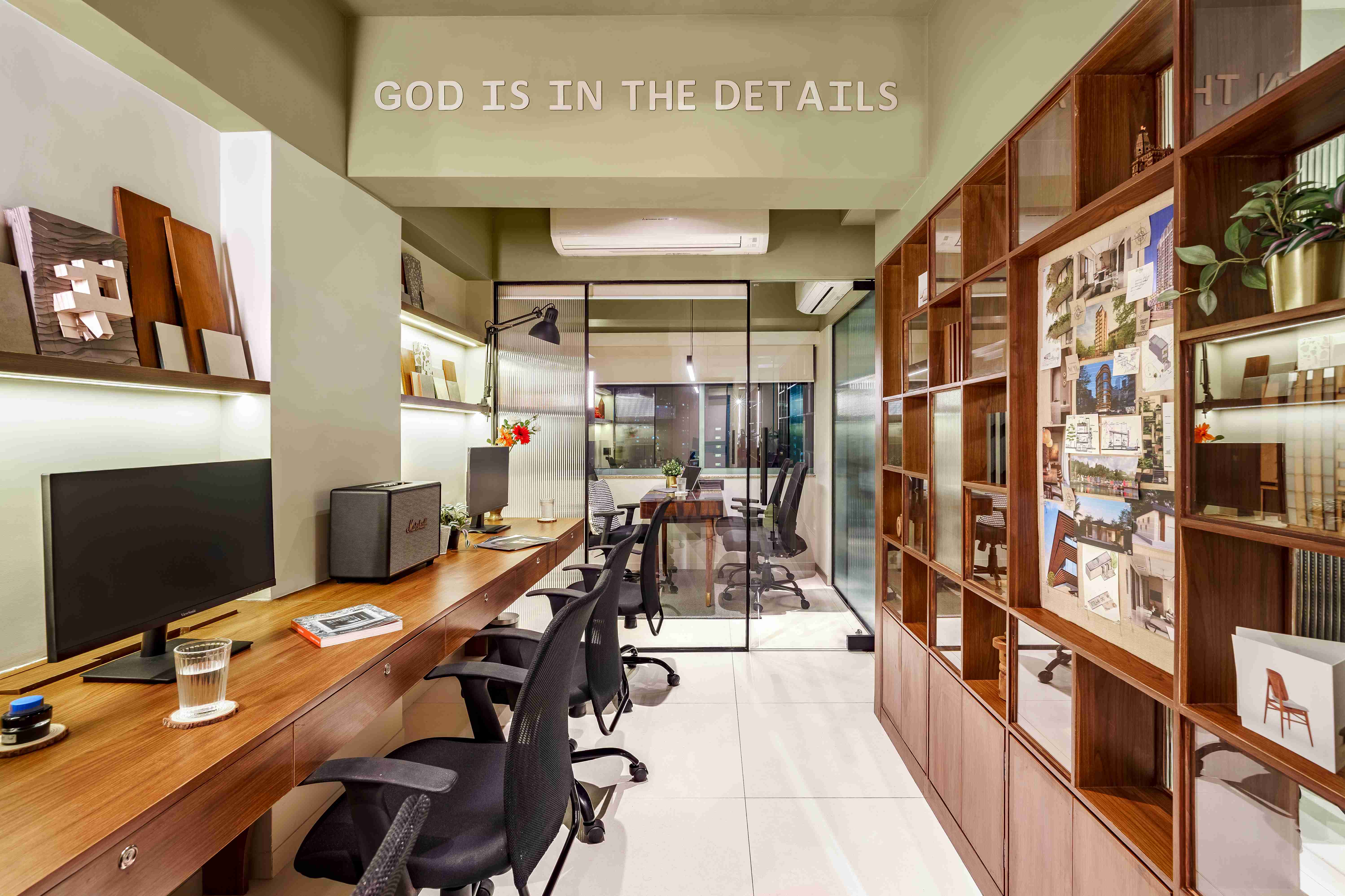 Perched above the steady hum of Mumbai, the Kenzen Headquarters is not a space that demands attention but one that invites reflection. Designed by Kenzen Architects for themselves, it serves as both studio and statement, capturing the spirit of how the team works, thinks, and creates. The brief was personal and introspective. The studio had to support deep focus, foster collaboration, and reflect values of simplicity, warmth, and precision. Rather than chasing trends, the design began with fundamental questions: How should we feel here? How do we move, pause, and create through the day? The answers shaped a workplace functional yet emotionally attuned. The spatial layout flows with clarity. An understated entrance with a compact wooden desk and a quiet waiting nook sets a grounded tone. The conference room, veiled in fluted glass, balances openness and privacy, anchored by a round walnut table. A subtle etching on the glass, “Dialogue drives creativity,” frames the room’s purpose. The main workspace forms the heart of the studio. A long timber desk encourages rhythm between collaboration and solitude, while black shelves display books, models, and samples. A sage green wall, inscribed with “God is in the details,” anchors the space as a living mantra. A central wooden wall of niches divides and connects, acting as storage, display, and light filter. Private cabins along the glazed edge offer quiet focus with timber furniture, soft rugs, and muted green ceilings. Even the printing corner, hidden behind fluted glass, is designed with care. Materials and colors remain calm and grounded: natural wood, fluted glass, black metal, muted greens, and warm whites. Every detail is chosen for longevity and feel. Kenzen Headquarters is not about performance but about creating conditions for thoughtful work, a studio that listens to itself and quietly sustains its people.