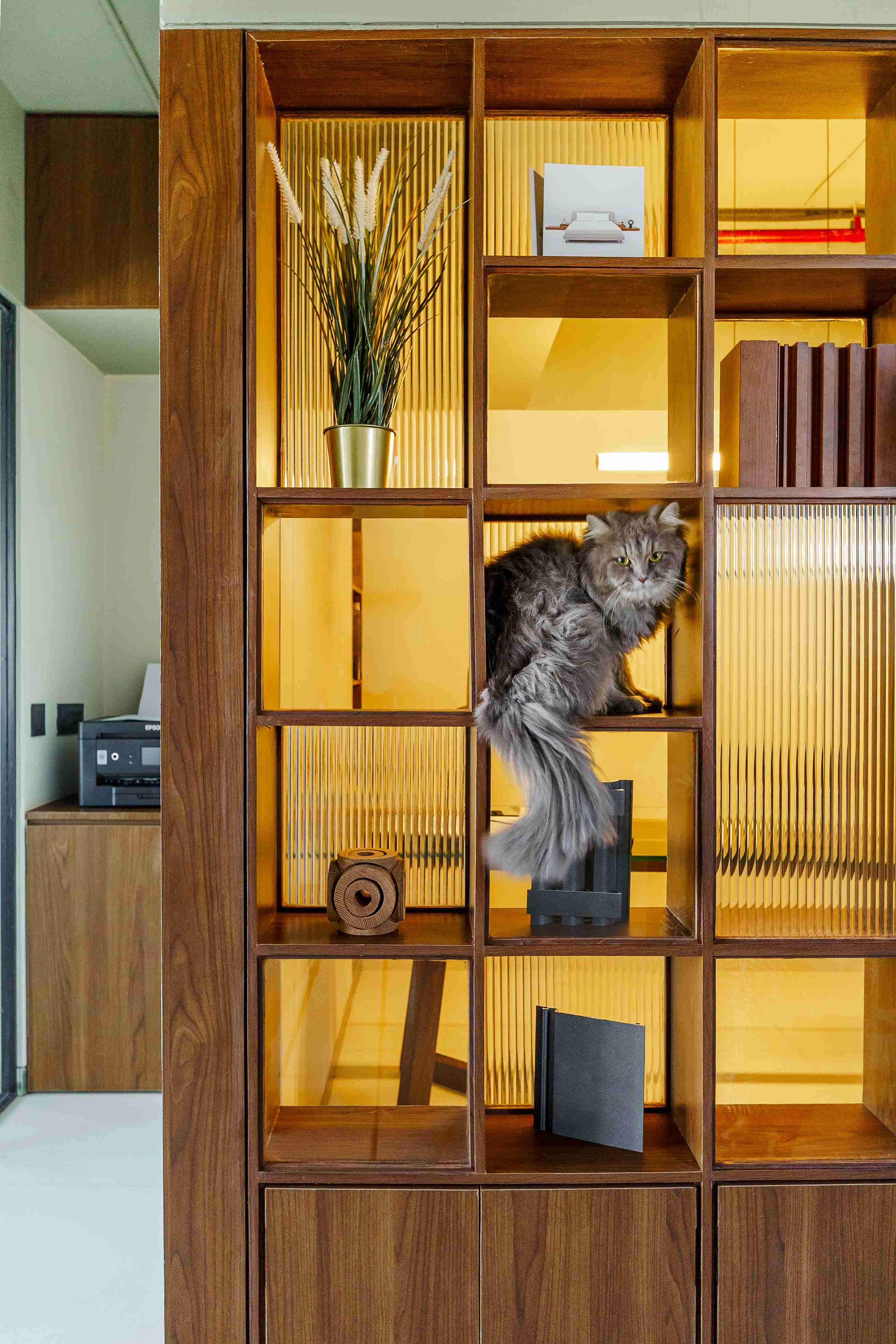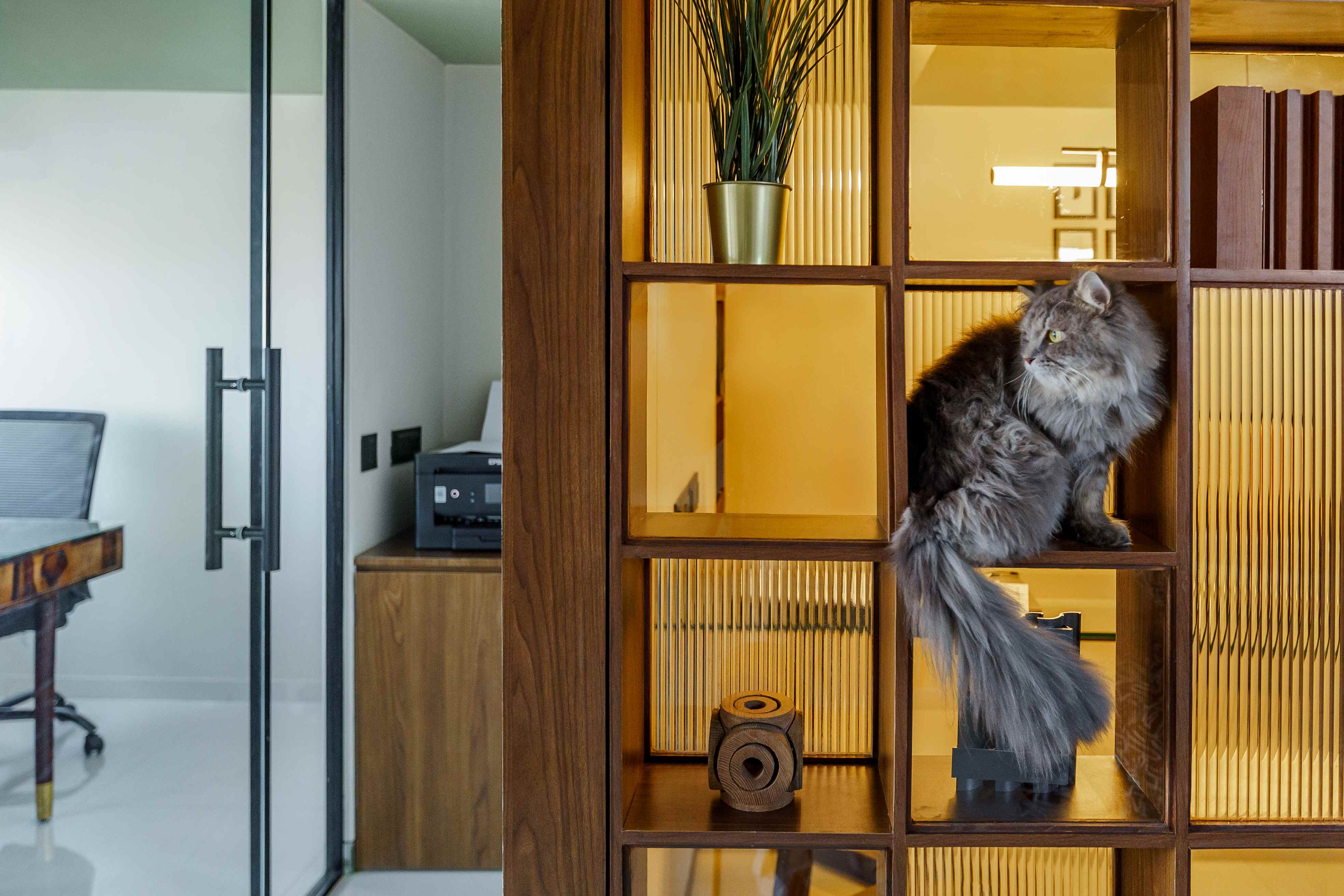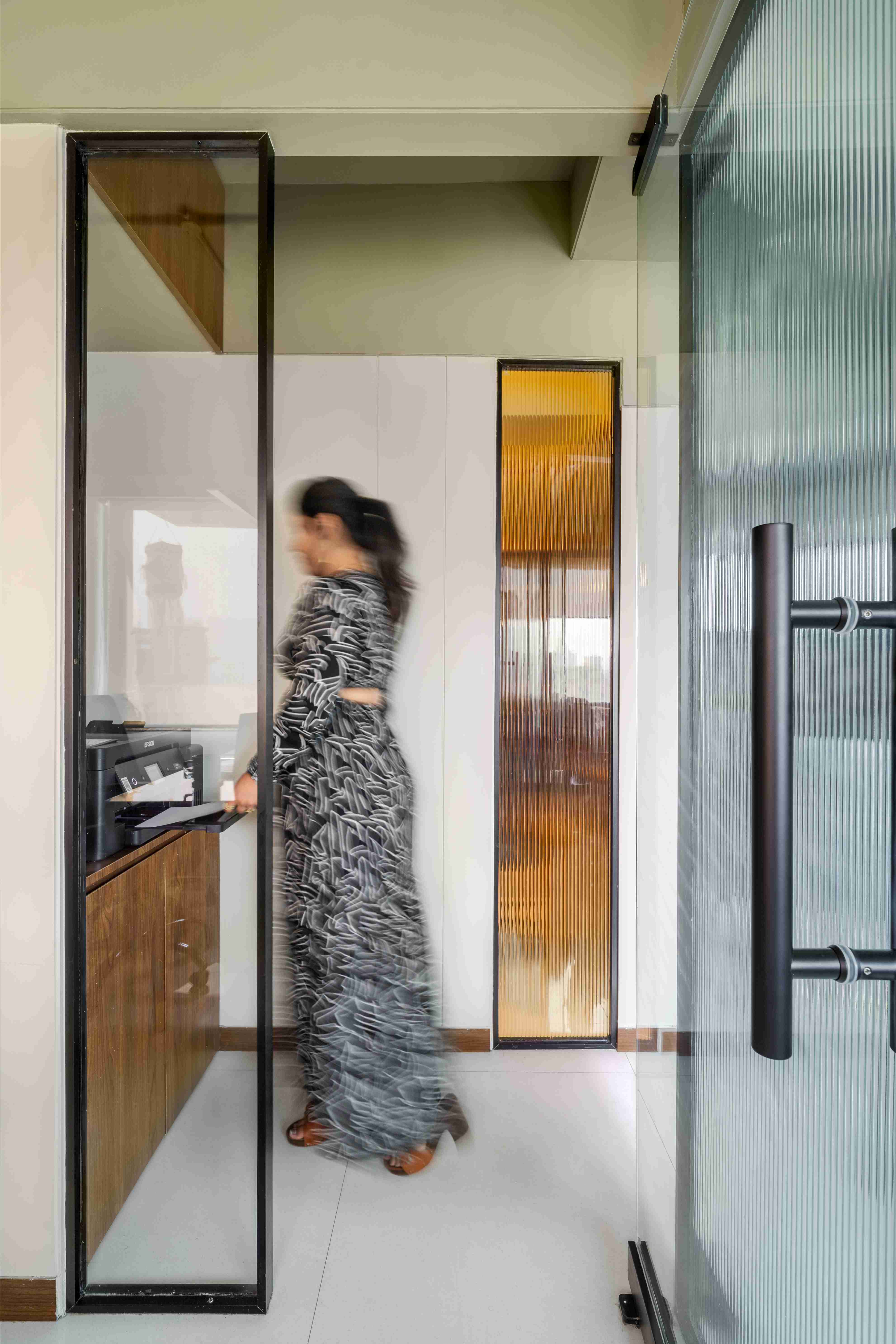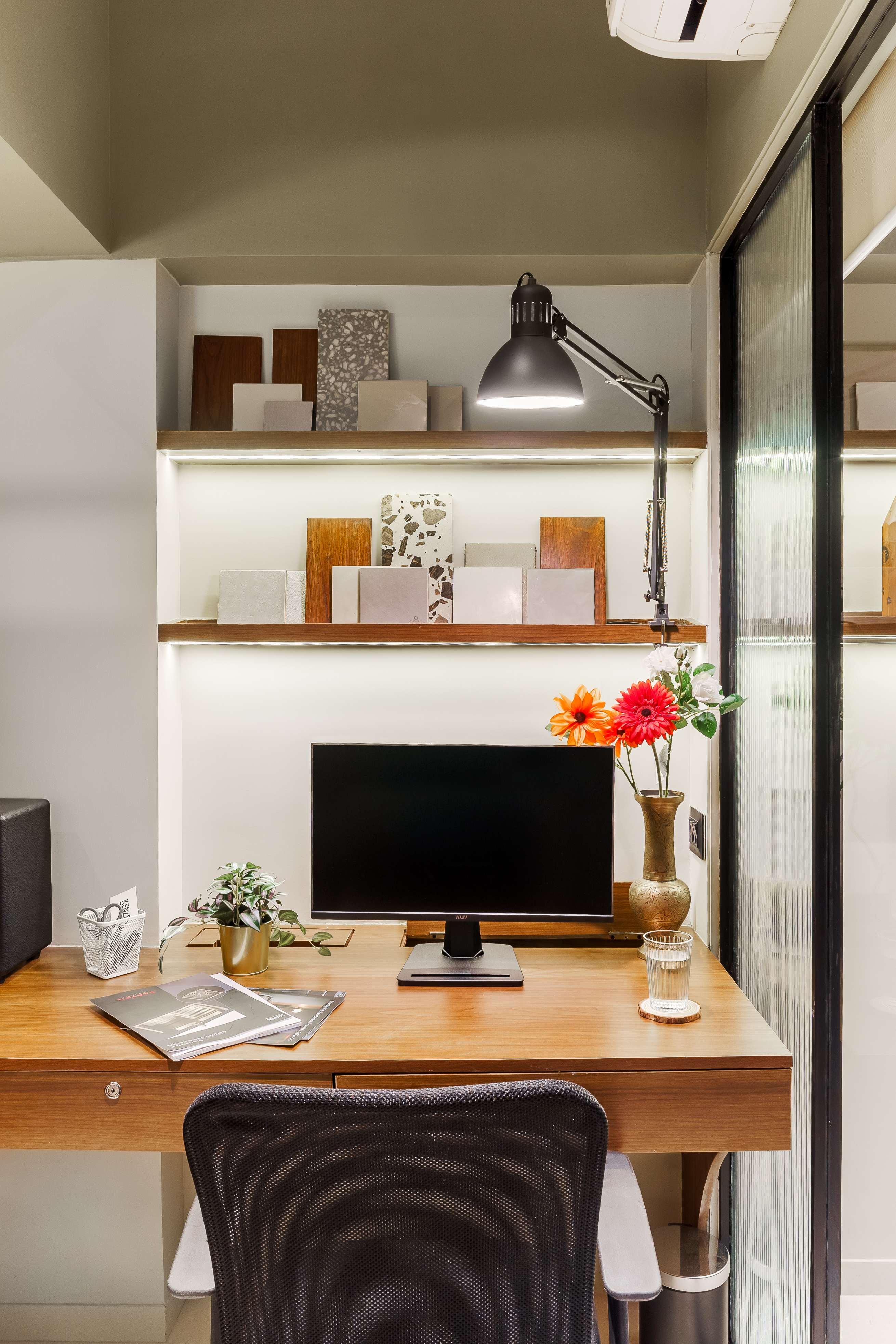 Perched above the steady hum of Mumbai, the Kenzen Headquarters is not a space that demands attention but one that invites reflection. Designed by Kenzen Architects for themselves, it serves as both studio and statement, capturing the spirit of how the team works, thinks, and creates. The brief was personal and introspective. The studio had to support deep focus, foster collaboration, and reflect values of simplicity, warmth, and precision. Rather than chasing trends, the design began with fundamental questions: How should we feel here? How do we move, pause, and create through the day? The answers shaped a workplace functional yet emotionally attuned. The spatial layout flows with clarity. An understated entrance with a compact wooden desk and a quiet waiting nook sets a grounded tone. The conference room, veiled in fluted glass, balances openness and privacy, anchored by a round walnut table. A subtle etching on the glass, “Dialogue drives creativity,” frames the room’s purpose. The main workspace forms the heart of the studio. A long timber desk encourages rhythm between collaboration and solitude, while black shelves display books, models, and samples. A sage green wall, inscribed with “God is in the details,” anchors the space as a living mantra. A central wooden wall of niches divides and connects, acting as storage, display, and light filter. Private cabins along the glazed edge offer quiet focus with timber furniture, soft rugs, and muted green ceilings. Even the printing corner, hidden behind fluted glass, is designed with care. Materials and colors remain calm and grounded: natural wood, fluted glass, black metal, muted greens, and warm whites. Every detail is chosen for longevity and feel. Kenzen Headquarters is not about performance but about creating conditions for thoughtful work, a studio that listens to itself and quietly sustains its people.