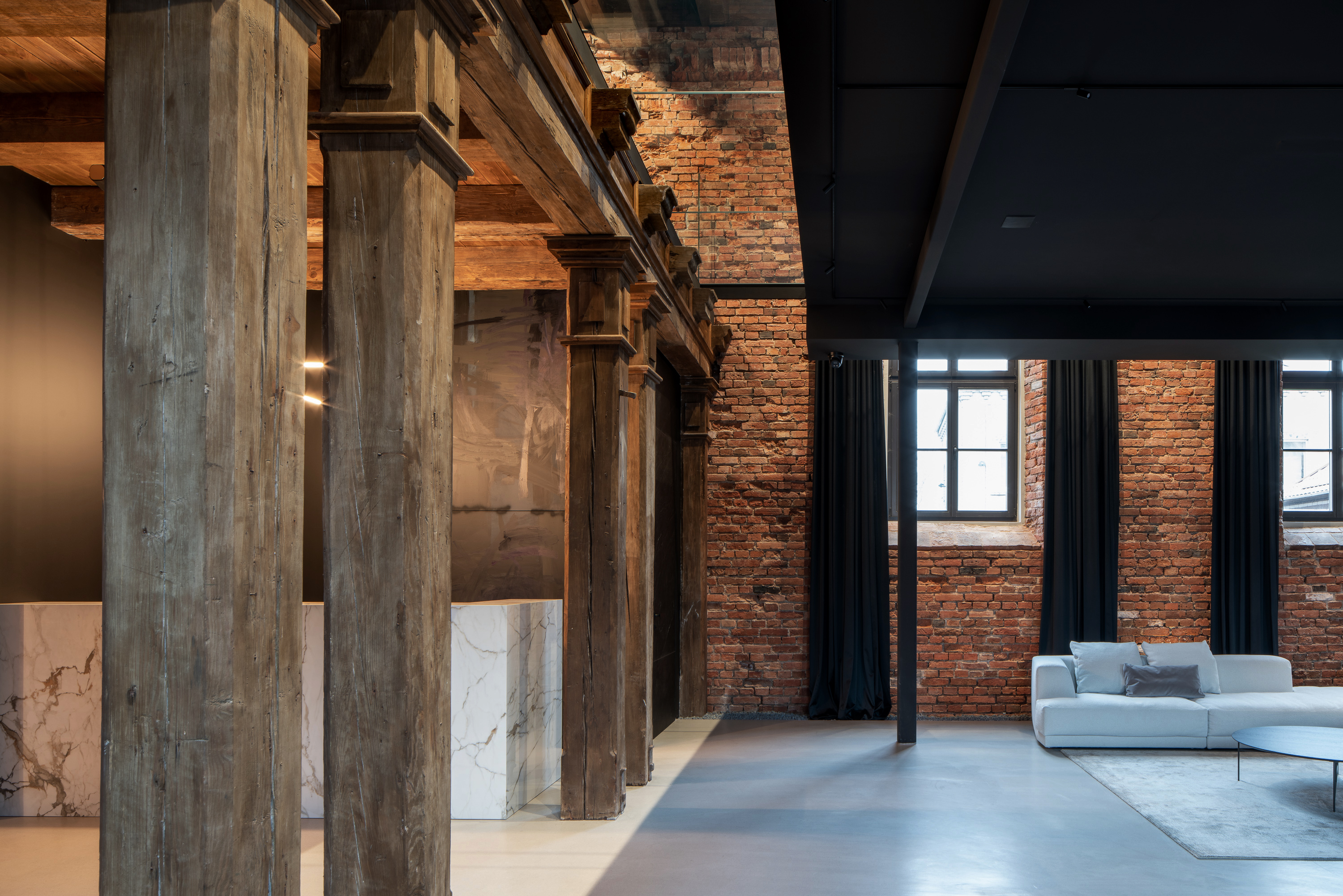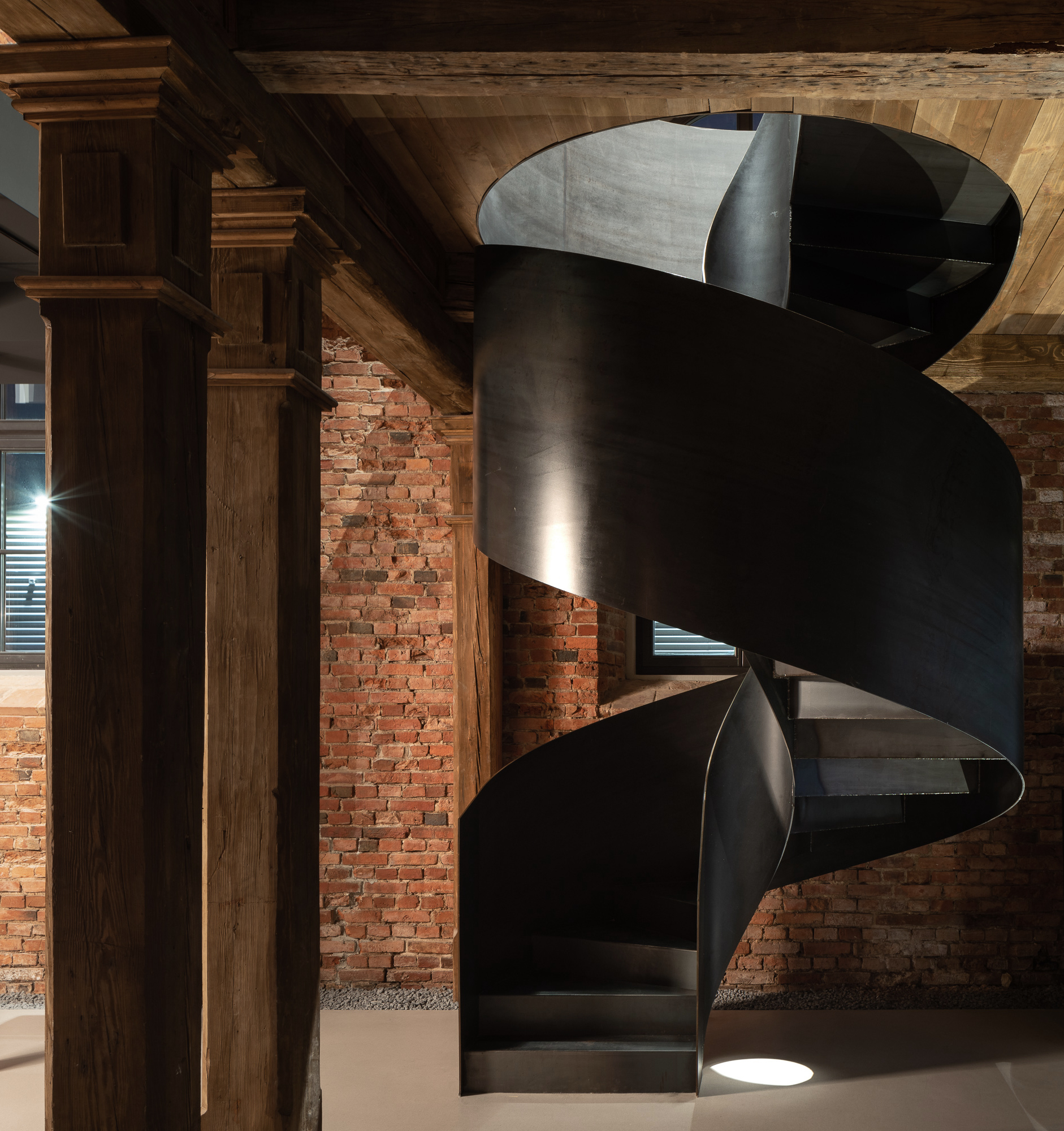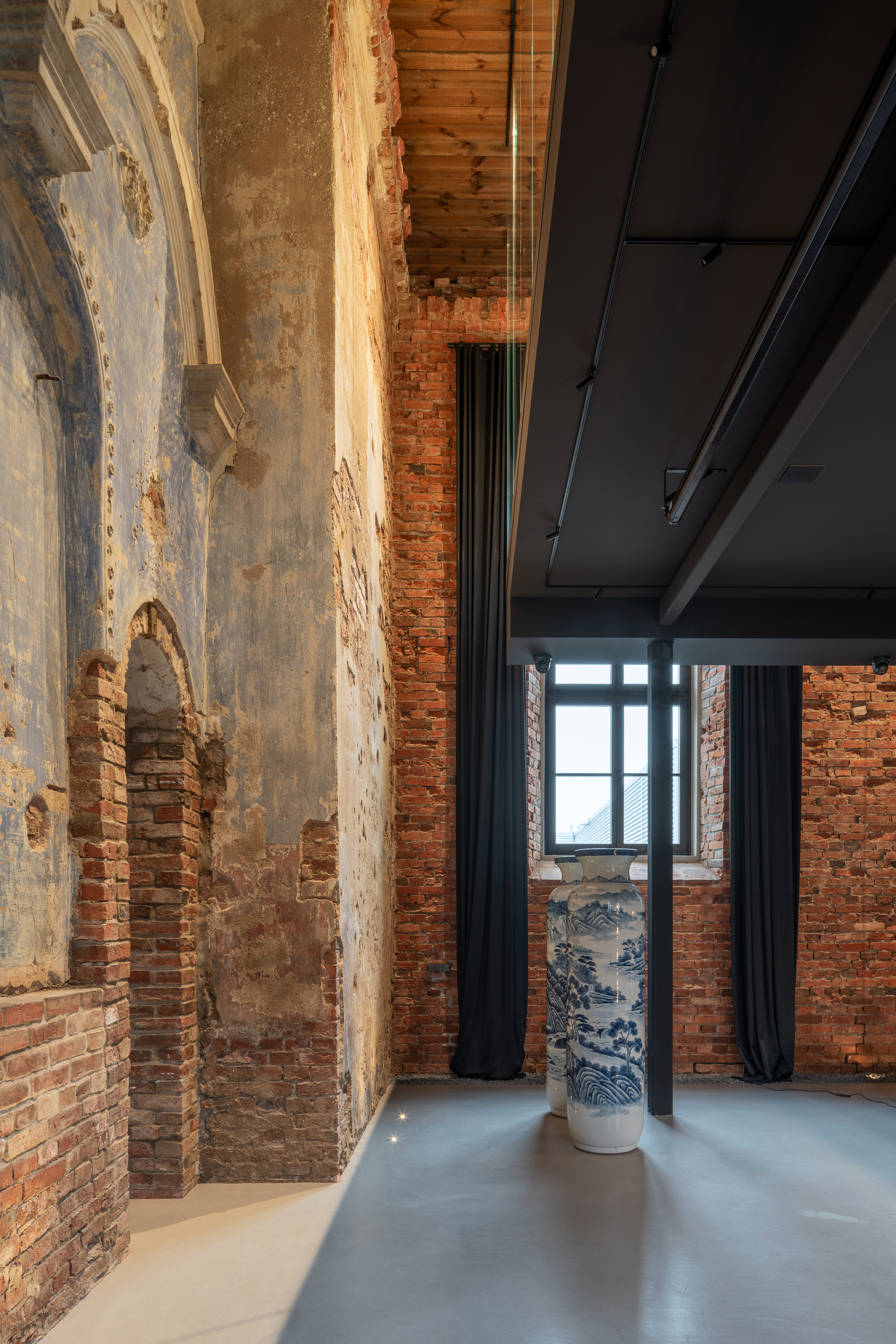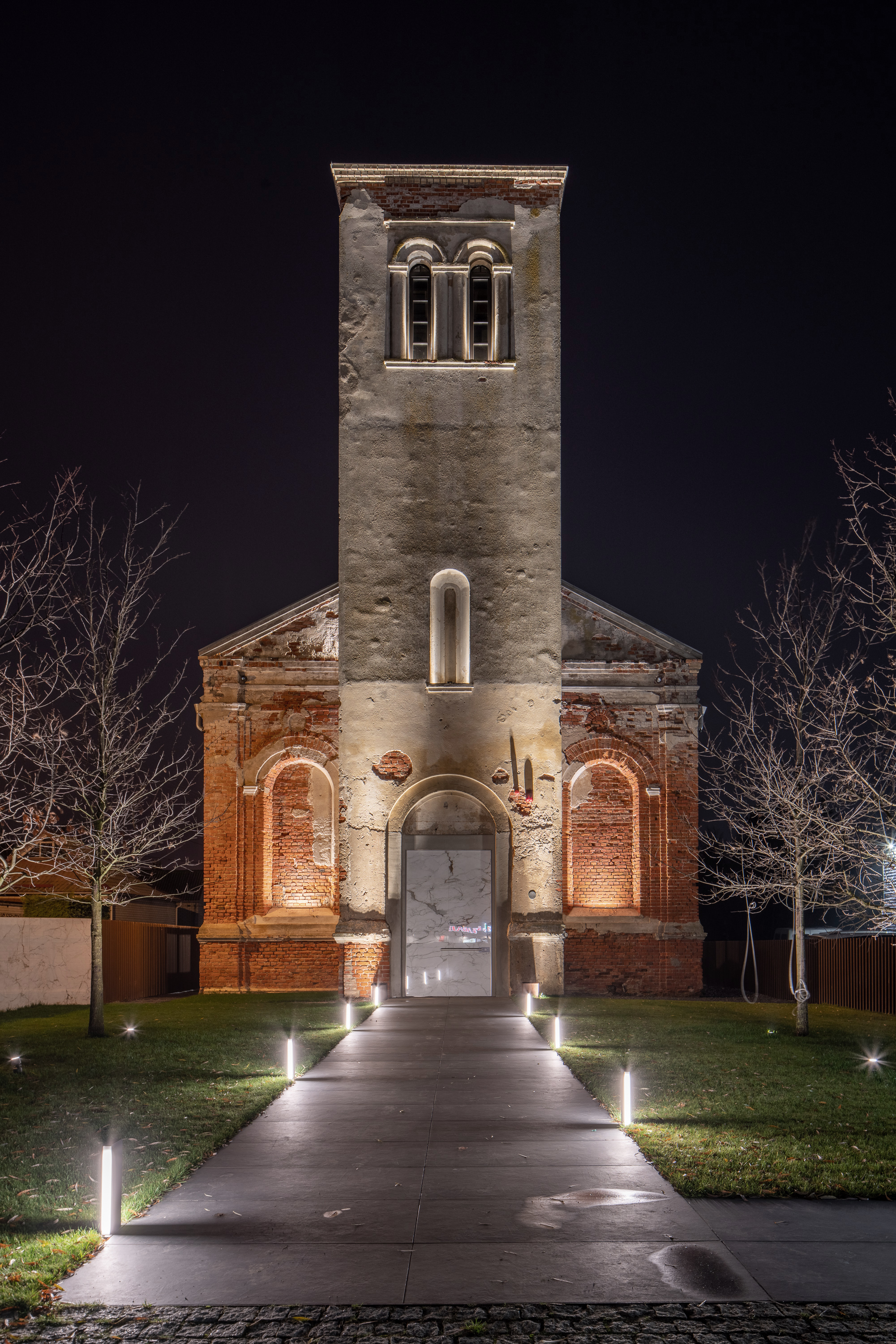 The project seeks to establish an aesthetic dialogue between heritage and contemporary architecture, highlighting the essential values of each through their synthesis. The reconstructed building, the Garliava Evangelical Lutheran Church built around 1860–1870 and listed in the Cultural Heritage Register under code 30618, had suffered decades of neglect. After being repurposed during the Soviet occupation as a recycling depot and later a fur-processing warehouse, it stood abandoned, roofless, and vandalized. The restoration began with essential stabilization: replacing timber roof structures, retiling with clay tiles, restoring the rainwater system, repairing granite foundations, and installing new historically accurate windows and stoneware doors. Modern utilities were discreetly integrated, including water supply, underfloor heating, and an air to water heating system. Every effort was made to preserve original elements such as the blue-painted altar wall and its plaster mouldings, wooden choir columns, and remaining clay tiles. The interior was reinterpreted for use as an exhibition and event venue. The main nave remains open and flexible, while a new black steel spiral staircase leads to the choir balcony. A reception and meeting space with kitchenette occupies the former presbytery. A lightweight mezzanine suspended on six steel columns and detached from the historic walls accommodates administrative functions. Its glass walkway and frameless railings maintain spatial continuity and transparency. Material selection emphasized harmony rather than imitation. Exposed brick walls were conserved, and new gray epoxy flooring contrasts subtly with historic textures. The color palette is restrained — black, gray, and white tones — allowing the patina of heritage to dominate. Once derelict, the church now stands renewed as Righetto Gallery, a public cultural venue that reconnects Garliava with its architectural heritage. The surrounding grounds were redesigned with granite paving, oak trees, and atmospheric lighting, restoring the church as a civic and cultural landmark.