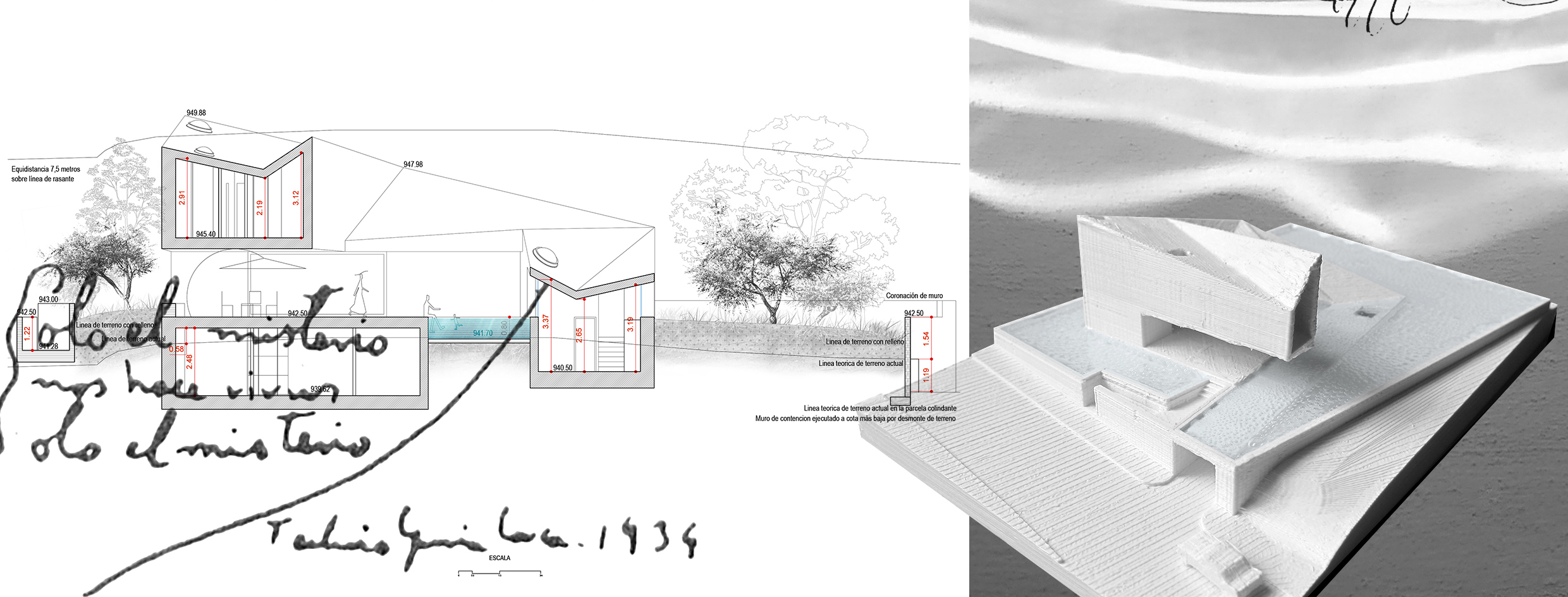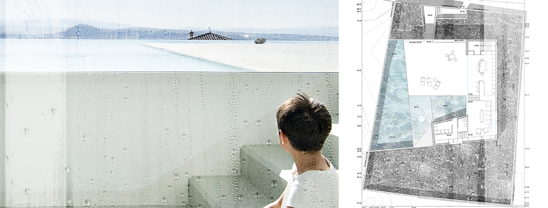 Piscina con Casa explores the possibilities of reimagining the relationship between water and the act of inhabiting. In this project, the house emerges from the water to create spaces that invite the inhabitant into a physical and sensory immersion. The proposal is understood as a tool for architectural research that comes to life through daily interaction and the user’s experience with a medium as fluid and symbolic as water. It encourages reflection on the role of design in creating meaningful and transcendent environments for people. The project proposes two complementary sequences. The experience of emerging begins underwater and ascends through the spaces of the house, where each room engages with the pool in a specific way. Various openings reveal glimpses of flooded patios and submerged skylights. Semi-sunken living areas, water-level windows, and exterior platforms shape a new topography of varying heights, offering unique relationships with both the water and the surrounding landscape. This path culminates in a raised lookout over the central flooded courtyard. The experience of submerging enables a direct connection with water. A shallow platform invites walking or resting, while a sloped zone allows the user to wade or submerge into the deeper areas of the pool, where one can swim, dive from the lookout, or contemplate the house through underwater windows. This layering of elements creates a rich and dynamic atmosphere, where the interplay of water, light, and architecture shifts throughout the day. The project also explores the intimate bond between its inhabitants and their environment, using water as a medium to enhance personal experience. By transforming the conventional domestic space into a personal retreat, water becomes a central element of daily life, prioritizing emotional and sensory connection, blurring the limits between inside and outside, and reconnecting with ancestral notions of inhabiting.