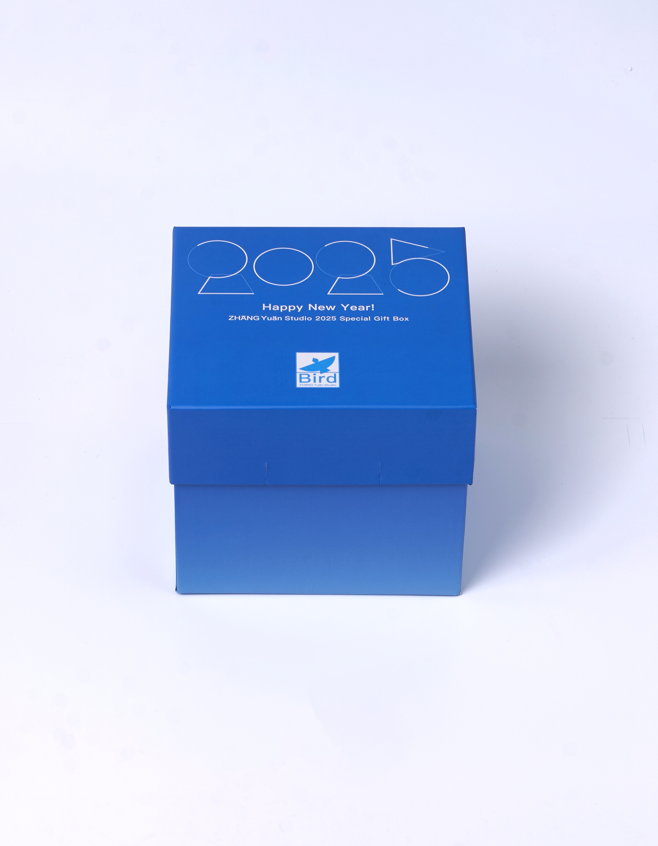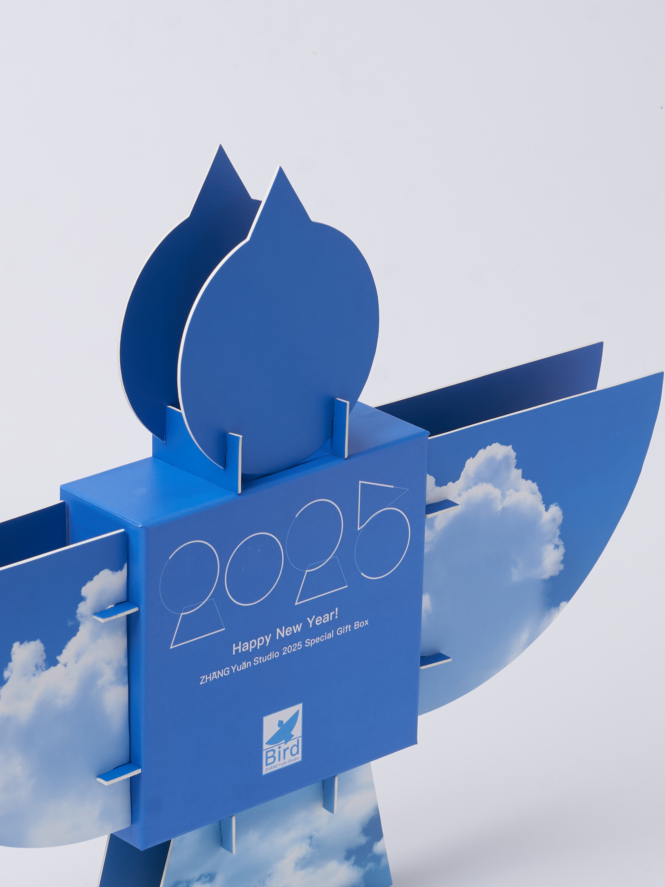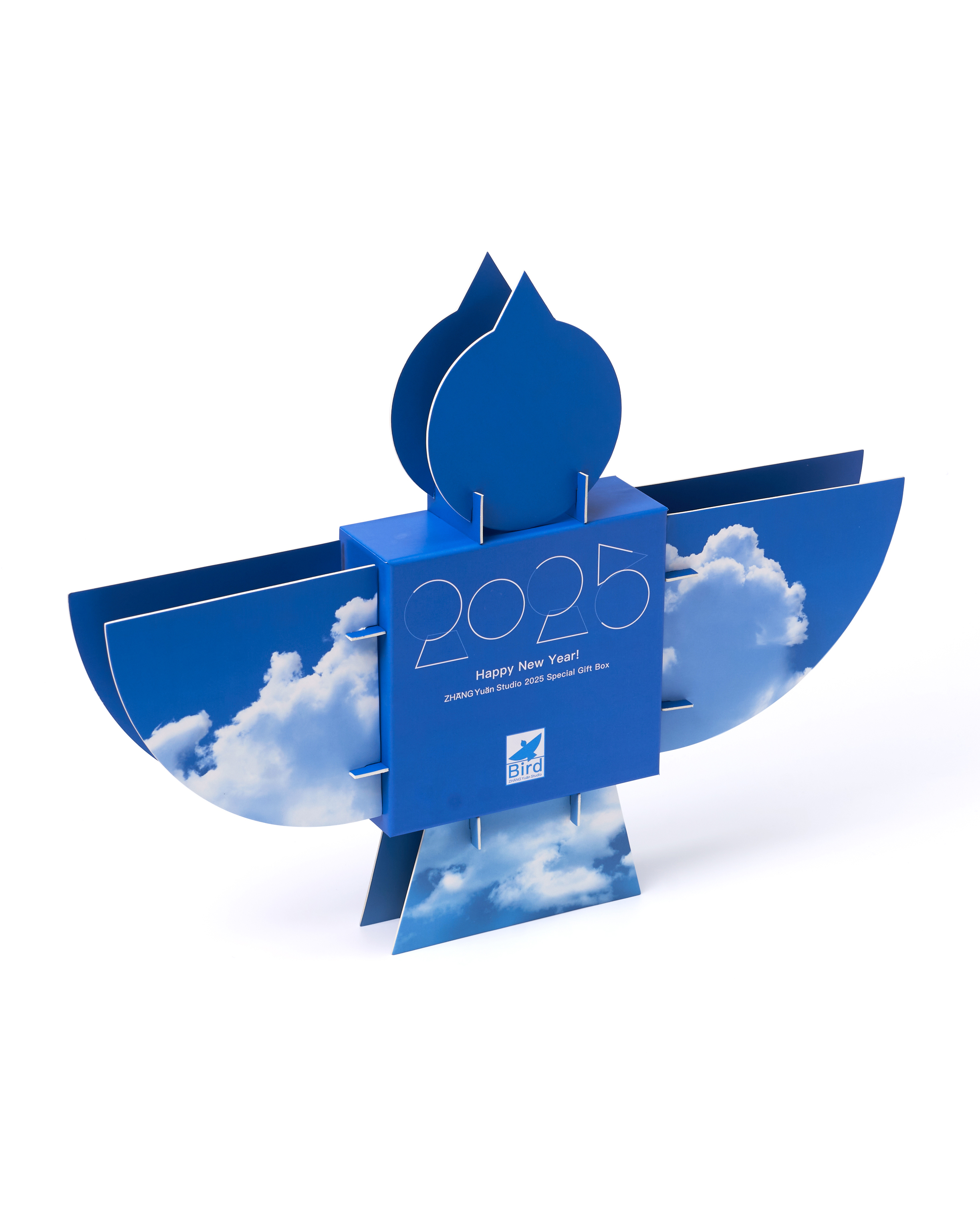 At the end of 2024, the design team was commissioned by ZHANGYUAN Studio to create the concept, visual identity, and packaging design for its 2025 New Year gift box. The design beautifully features a bird as its core visual symbol, embodying the essence of ZHANGYUAN Studio. Inside, the box holds a 2025 calendar along with a thoughtfully curated selection of branded products. The structure adopts a square telescopic lid-and-base format, transforming from a 16 cm cube into the majestic silhouette of a soaring bird with a wingspan of half a meter. Inspired by the geometric elements of the bird icon, the design team crafted a unique set of Arabic numerals for displaying the year and months. The calendar hangs from a dedicated hook at the center of the box, allowing for easy replacement and display. Color serves as a powerful defining element: inspired by the azure sky, the bird's two sides exhibit contrasting expressions of clarity—Drifting Clouds on one side and Crystal Blue on the other—enabling users to customize it to match their personal preferences. More than a festive object, the gift box carries profound symbolic meaning. Just as ZHANGYUAN illuminates his audience, the bird represents hope and courage, encouraging recipients to embrace clarity and strength in the face of uncertainty and challenges. Dimensions Folded: 17.5 × 16.5 × 15.5 cm Expanded: 50 × 40 × 6 cm