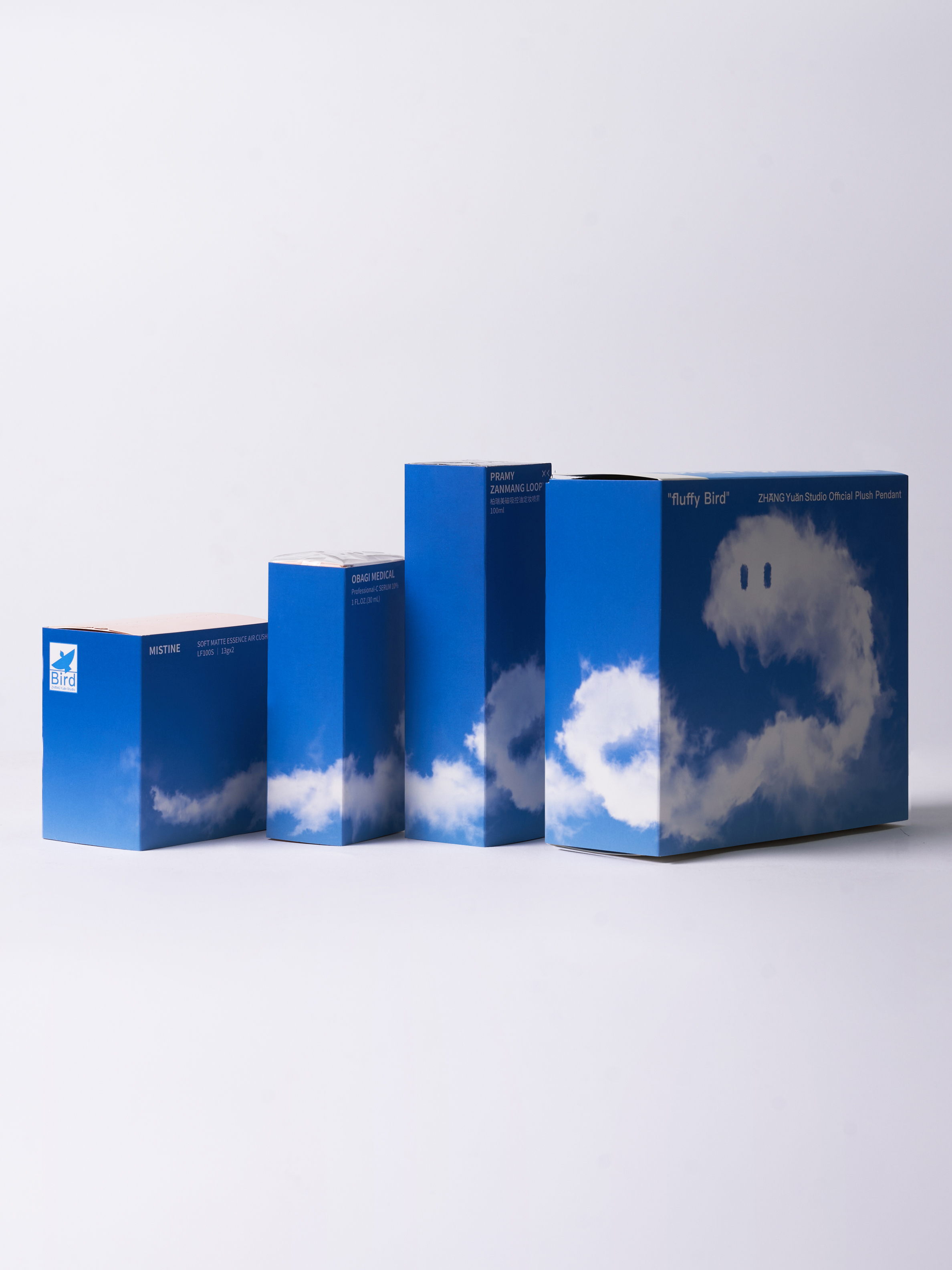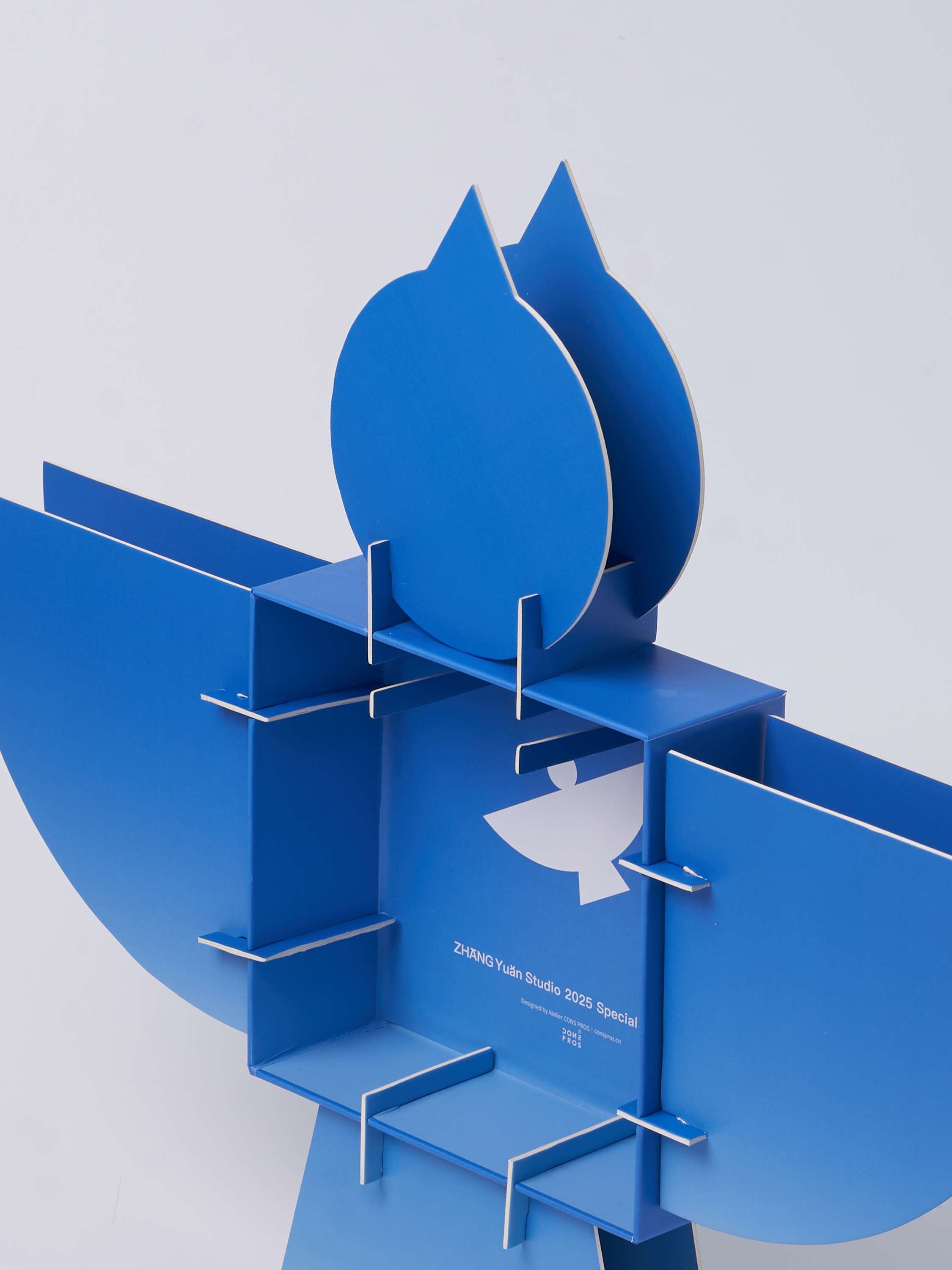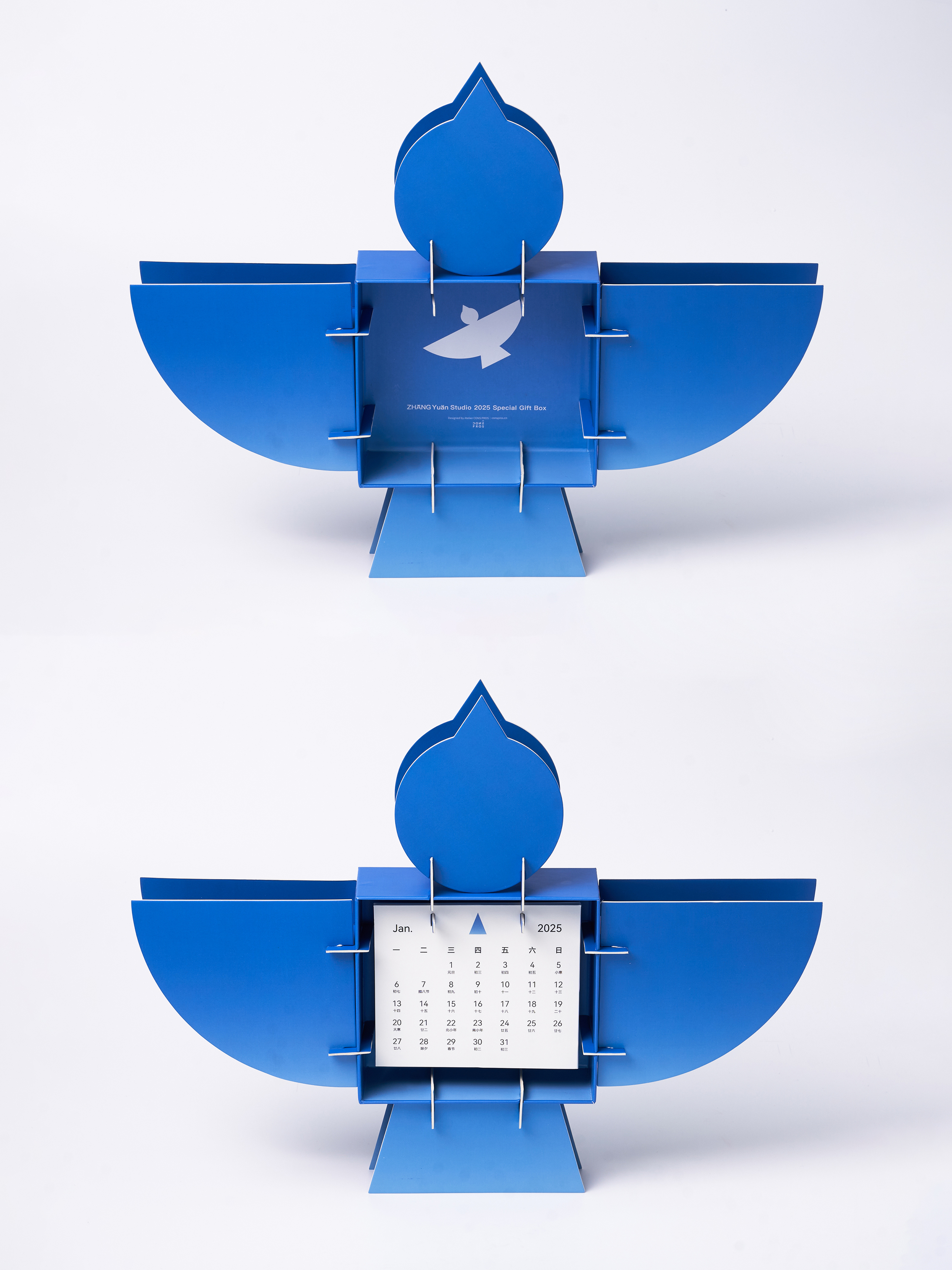 At the end of 2024, the design team was commissioned by ZHANGYUAN Studio to create the concept, visual identity, and packaging design for its 2025 New Year gift box. The design beautifully features a bird as its core visual symbol, embodying the essence of ZHANGYUAN Studio. Inside, the box holds a 2025 calendar along with a thoughtfully curated selection of branded products. The structure adopts a square telescopic lid-and-base format, transforming from a 16 cm cube into the majestic silhouette of a soaring bird with a wingspan of half a meter. Inspired by the geometric elements of the bird icon, the design team crafted a unique set of Arabic numerals for displaying the year and months. The calendar hangs from a dedicated hook at the center of the box, allowing for easy replacement and display. Color serves as a powerful defining element: inspired by the azure sky, the bird's two sides exhibit contrasting expressions of clarity—Drifting Clouds on one side and Crystal Blue on the other—enabling users to customize it to match their personal preferences. More than a festive object, the gift box carries profound symbolic meaning. Just as ZHANGYUAN illuminates his audience, the bird represents hope and courage, encouraging recipients to embrace clarity and strength in the face of uncertainty and challenges. Dimensions Folded: 17.5 × 16.5 × 15.5 cm Expanded: 50 × 40 × 6 cm